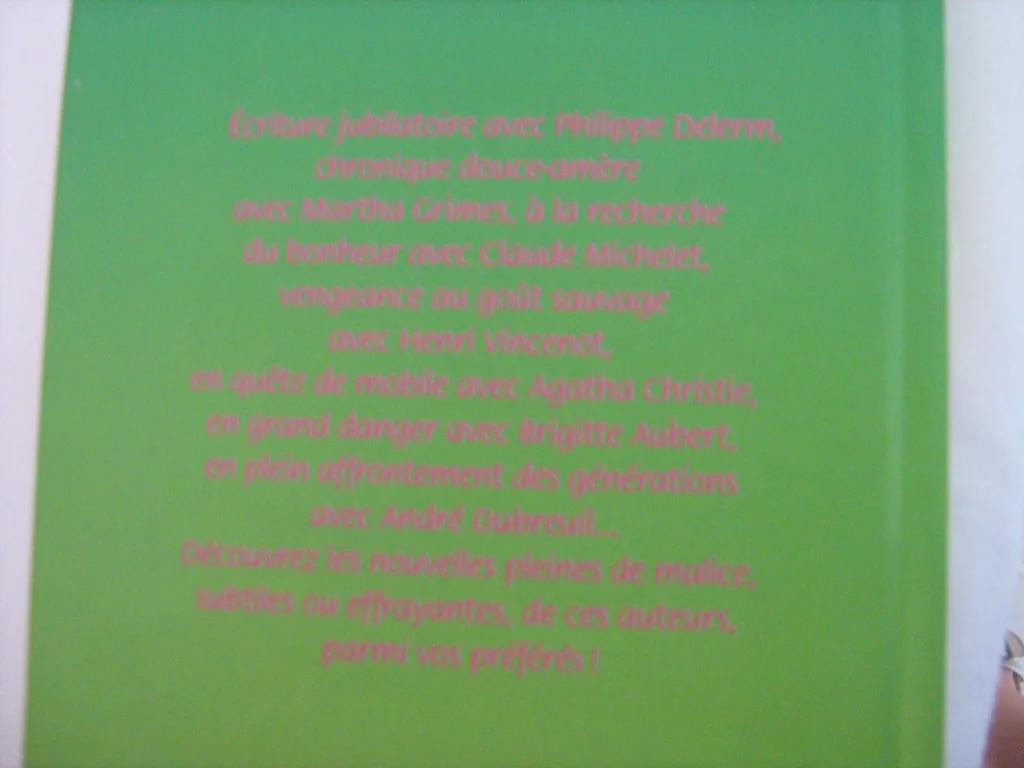 Vends livre de 7 nouvelles à lire. Comme neuf. "Écriture jubilatoire avec Philippe Delerm, chronique douce-amère avec Martha Grimes, à la recherche du bonheur avec Claude Michelet, vengeance au goût sauvage avec Henri Vincenot, en quête de mobile avec Agatha Christie, en grand danger avec Brigitte Aubert, en plein affrontement des générations avec André Dubreuil... Découvrez les nouvelles pleines de malice, subtiles ou effrayantes, de ces auteurs, parmi vos préférés !" N'hésitez pas à consulter mes autres annonces.