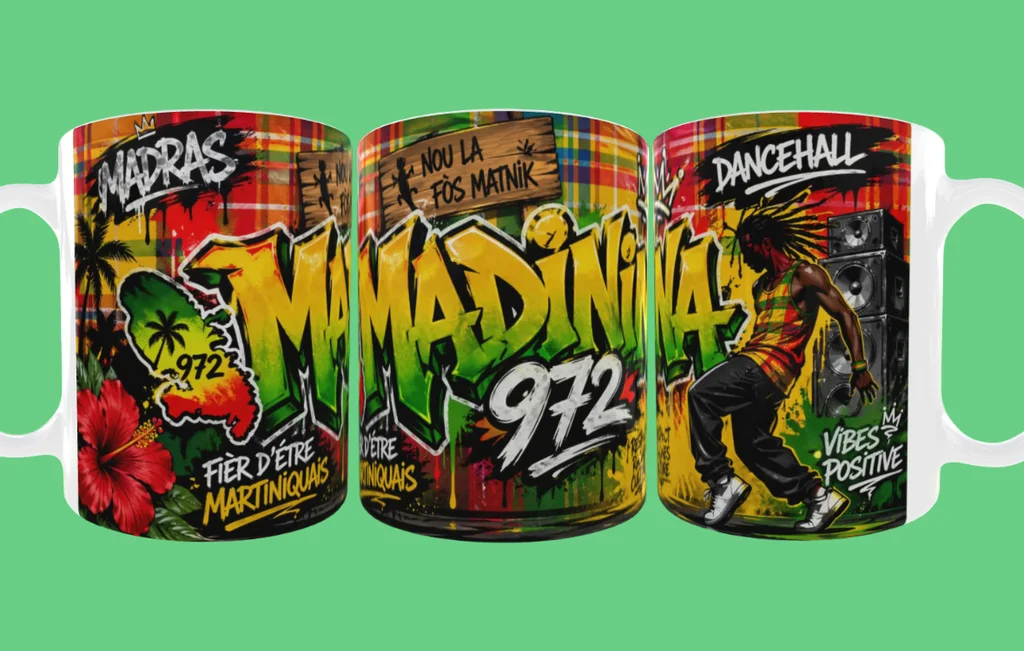 Je vends cette tasse en céramique aux couleurs de la Martinique. Des mugs originaux et colorés pour apporter une touche de culture caribéenne à votre table ou à votre collection. - Type de produit : tasse et mugs - Matière : Céramique - Couleur / Motif : Multicolore avec motifs Martinique (graffiti, fleurs, textes culturels) - Designs : Mamamadinia 972, Fier d'être Martiniquais, Dancehall Vibes Positif État neuf N'hésitez pas à me contacter pour plus d'informations ou de photos.