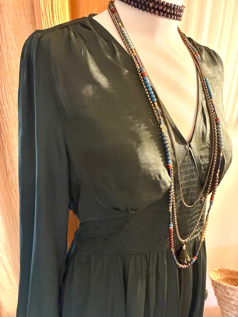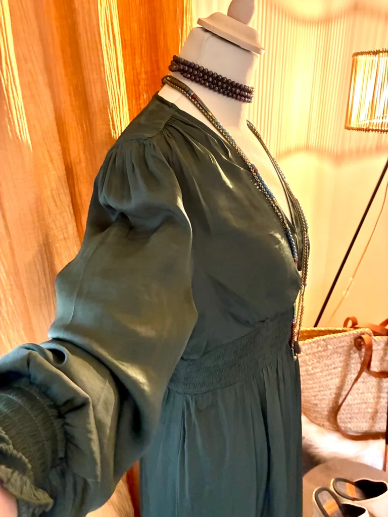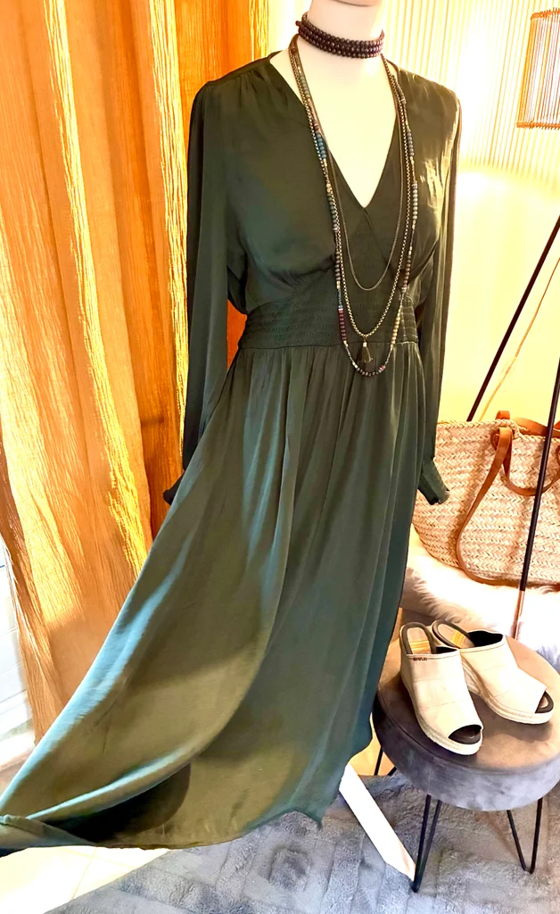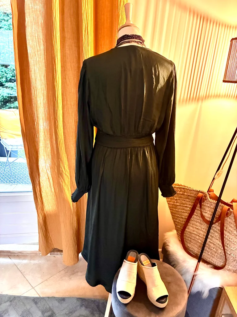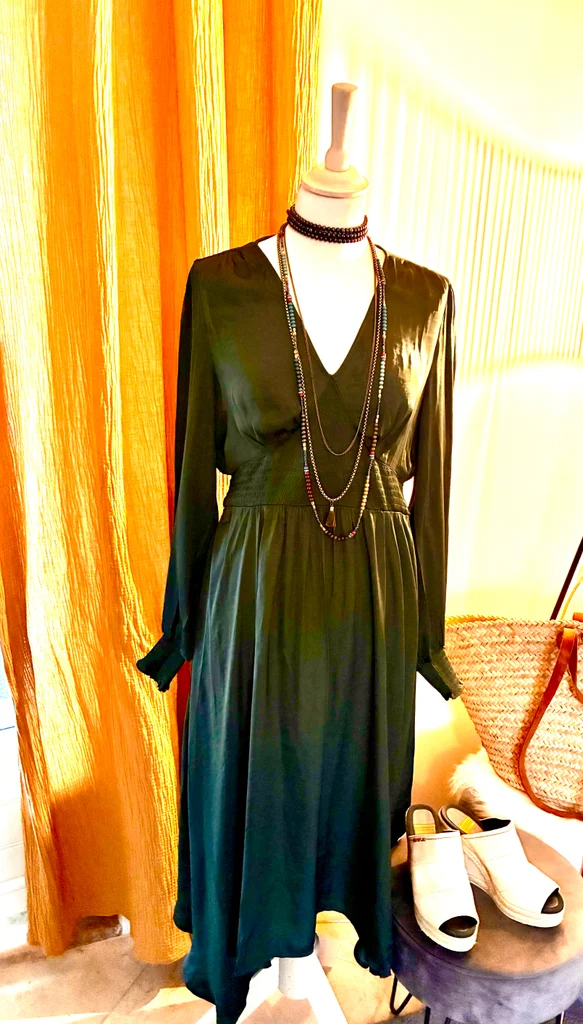 🌿 Robe Longue Satinée - Les Petites Bombes Marque : Les Petites Bombes (LPB) Taille : M / 38 Matière : 100% Polyester (aspect satiné fluide) Condition : Neuf avec étiquette 🏷️ L'œil d'Opla : On craque pour cette pièce qui combine élégance et confort. Sa couleur vert forêt profonde et son fini satiné captent la lumière de manière incroyable. C'est la robe parfaite pour une transition jour/nuit impeccable. Pourquoi on l'aime ? • La silhouette : Sa taille haute marquée par de larges smocks élastiqués crée une coupe flatteuse pour toutes les morphologies. • Le décolleté : Un col en V croisé juste ce qu'il faut pour le chic. • Les manches : Coupe légèrement ballon avec poignets froncés pour une touche romantique. • Le tombé : Une jupe fluide qui accompagne chaque mouvement. ✨ Conseil style : Portez-la avec des sandales compensées pour un look bohème chic de cérémonie, ou des boots en cuir pour un style plus citadin. #Opla #SecondeMain #LPB #LesPetitesBombes #RobeSatin #VertSapin #ModeRes [Description tronquée]