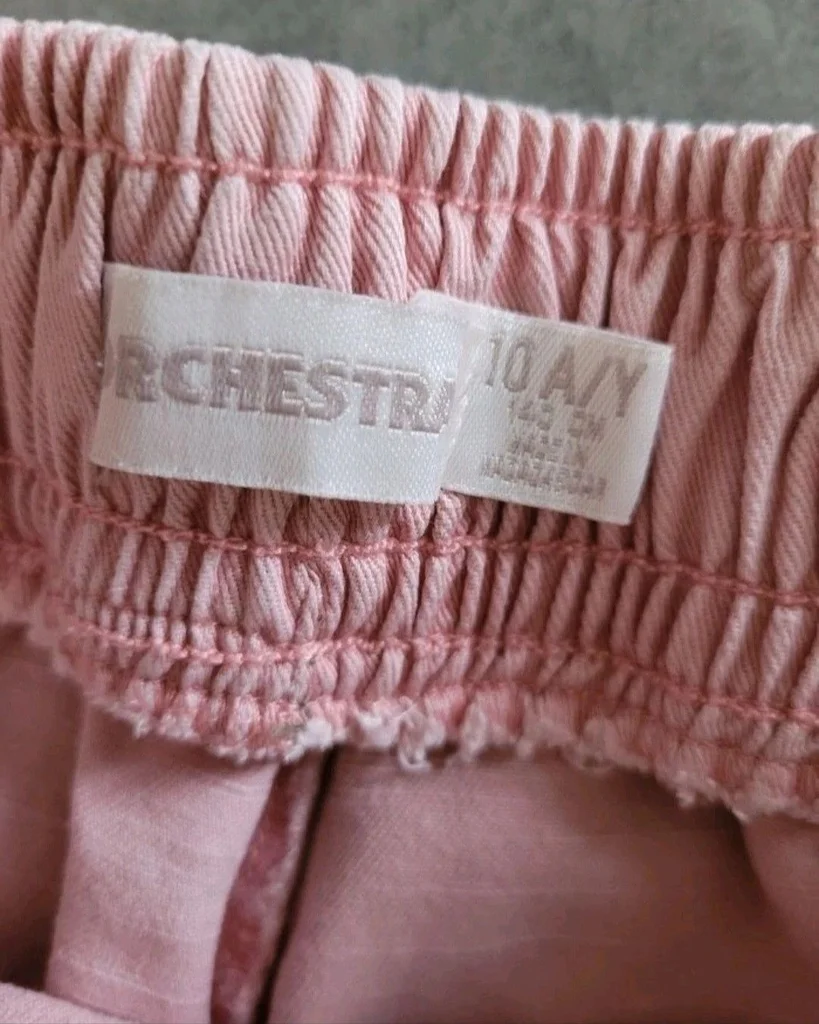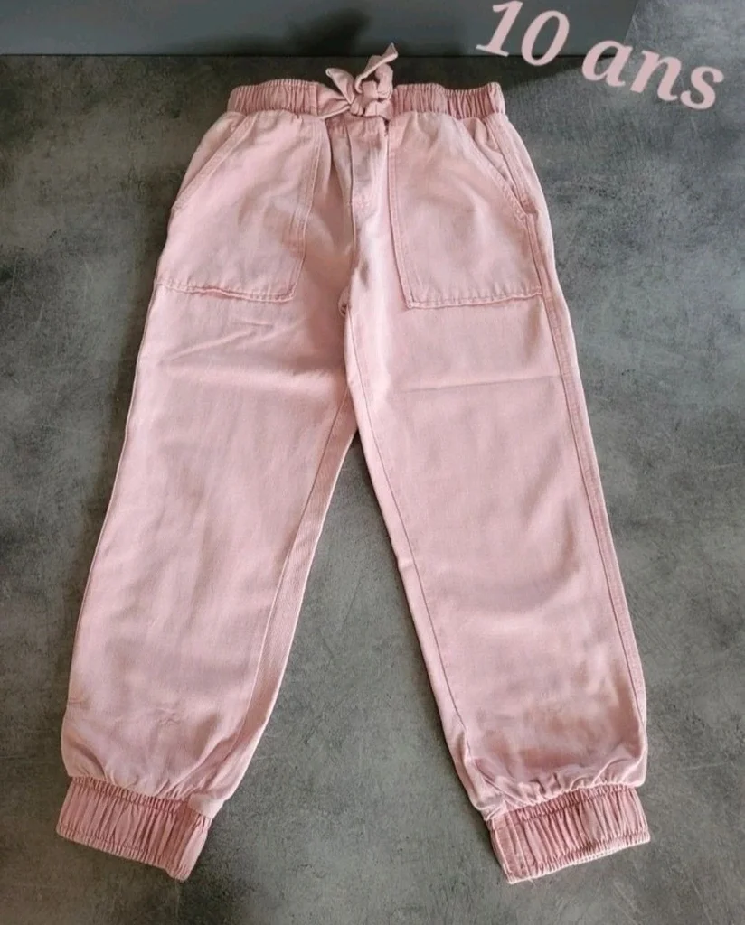 Vends ce joli pantalon style cargo/jogger de la marque Orchestra, en excellent état. Couleur : Vieux rose / Rose pastel, très facile à assortir. Taille : 10 ans (étiquette 140 cm). Coupe : Style décontracté avec une taille élastiquée et un lien de serrage pour un ajustement parfait. Détails : * Deux grandes poches plaquées à l'avant (style cargo). Bas de jambes resserrés par des élastiques (effet jogger). Matière type sergé de coton, souple et résistante. Idéal pour l'école ou les sorties, il offre une grande liberté de mouvement tout en restant stylé ! ✨ État : Très bon état (pas de taches, pas de trous). maison non-fumeur. 📦 Envoi rapide et soigné.