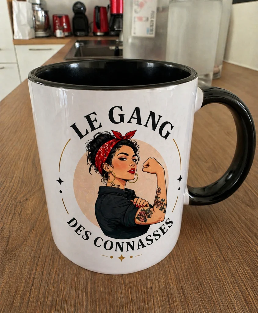 Je vends ce mug humoristique "Le Gang des Connasses" neuf. Un cadeau original et amusant pour les amies qui ont de l'humour ! - Type de produit : Mug humoristique - Modèle : Le Gang des Connasses - Matière : Céramique - Couleur : Blanc avec intérieur et anse noirs - Motif : Illustration d'une femme avec bandana rouge et texte humoristique - Contenance : Standard (environ 330 ml) - Compatibilité : Lave-vaisselle, Micro-ondes État neuf N'hésitez pas à me contacter pour plus d'informations ou de photos.