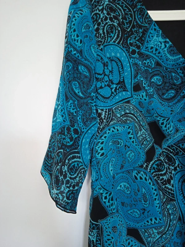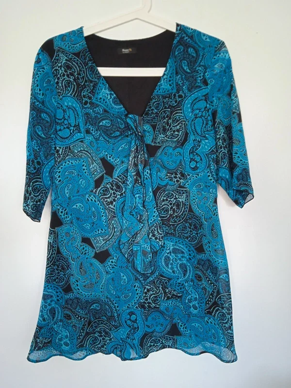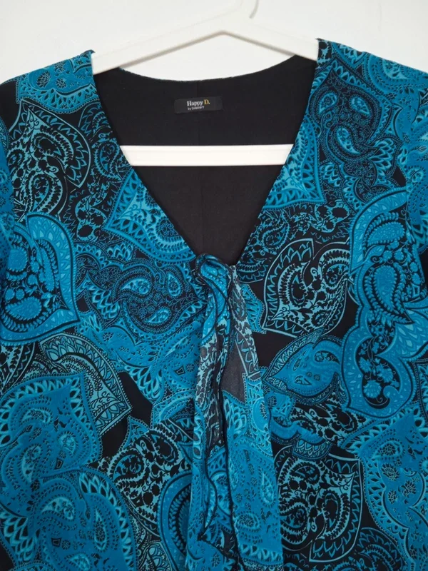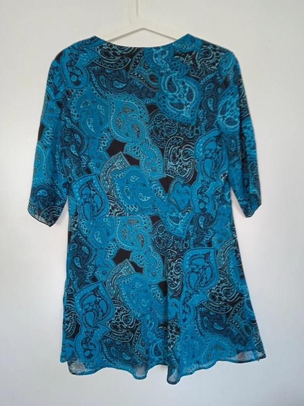 Tunique longue dans les tons bleus col V petit lien pour faire un noeud doublée très bon état et très bonne qualité damart taille 42 #tuniquelongue #tuniquelonguebleu #tunique42 #damart #tuniquedamart42 #blouselongue #blouselongue42