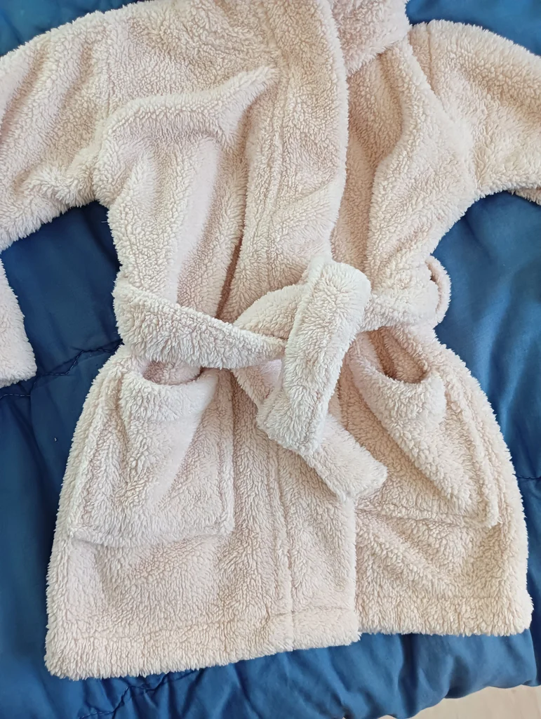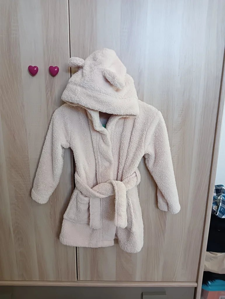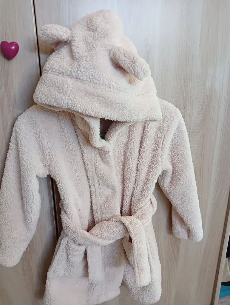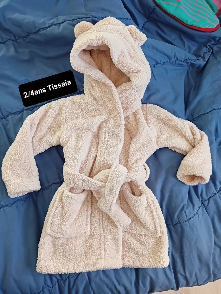 🔹 Peignoir / Robe de chambre, Couleur mixte . En très bon état. ▪️Taille 2/4 ans ▪️Marque " Tissaia" ▪️capuche rigolote avec des petites oreilles + une ceinture. ▪️100% polyester