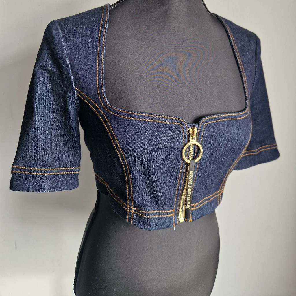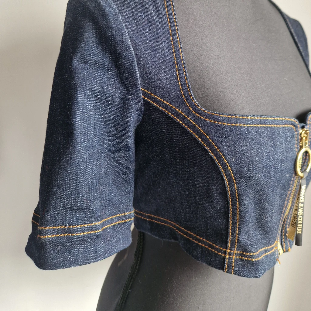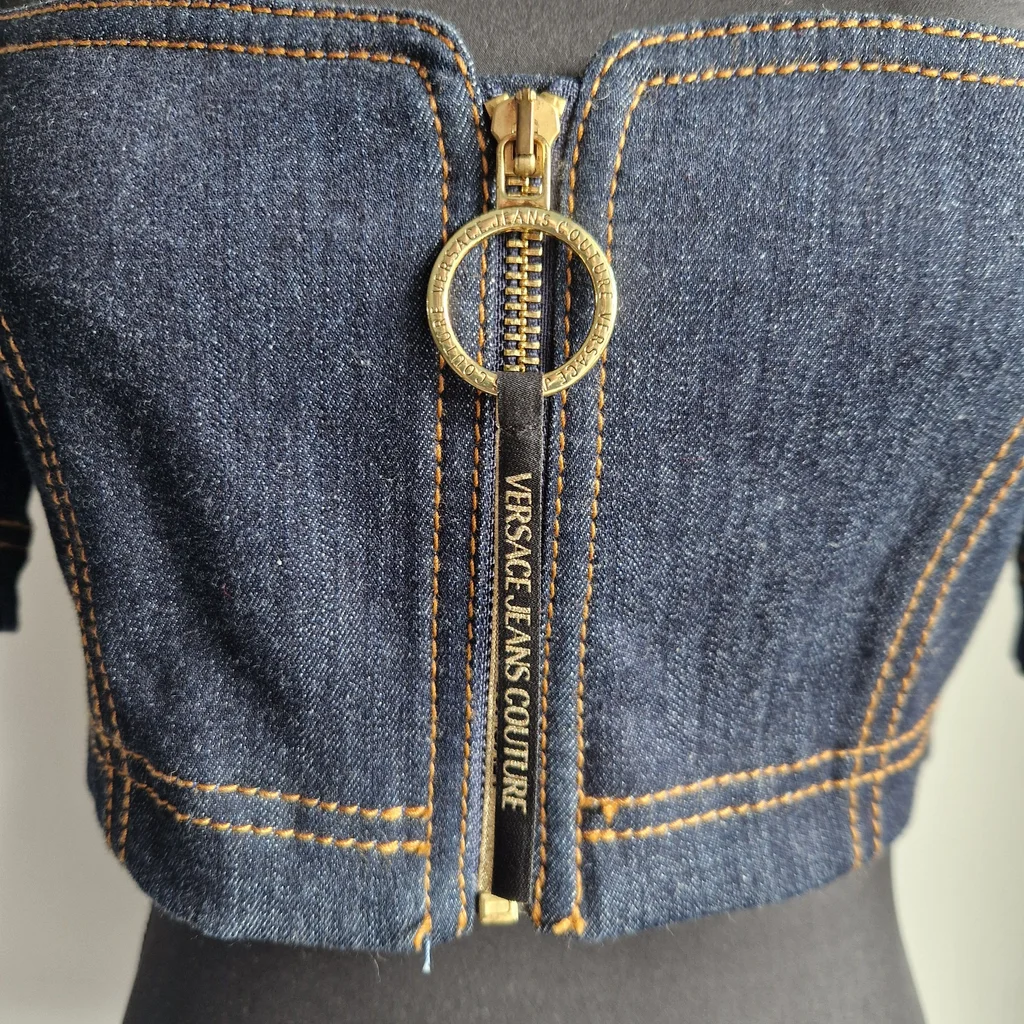 Magnifique top Versace Jeans Couture en denim. Légèrement extensible • Taille : S (FR 36)• Marque : Versace Jeans Couture• Matière : denim / jean• Fermeture : zip frontal avec anneau signature Versace• Manches courtes• Coupe : crop top / bustier structuré