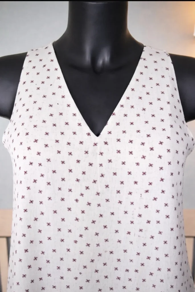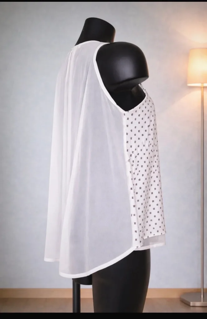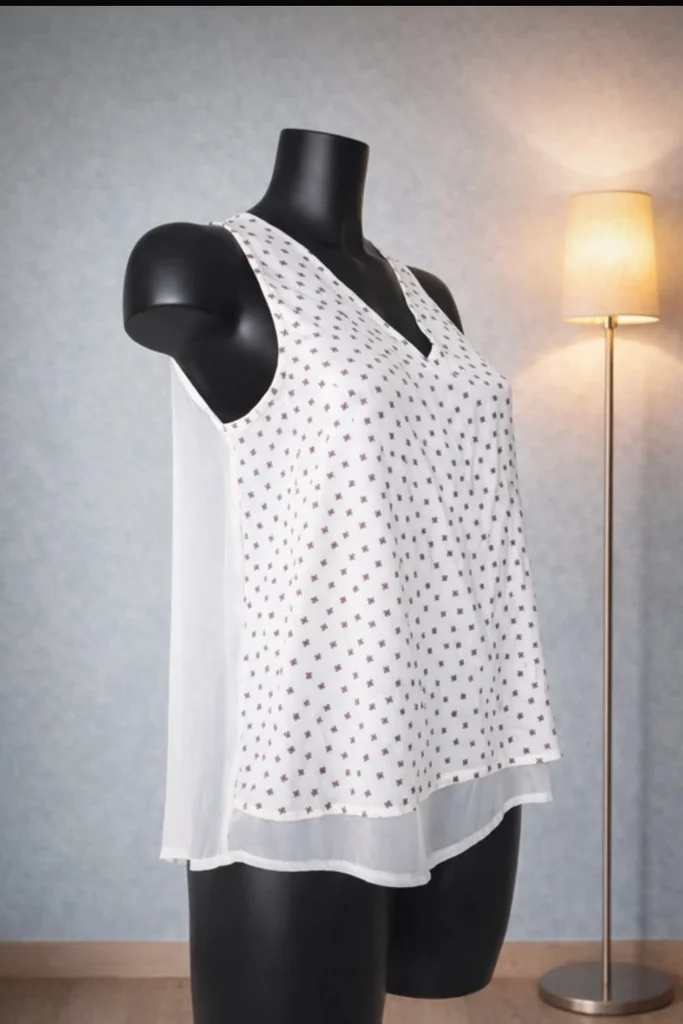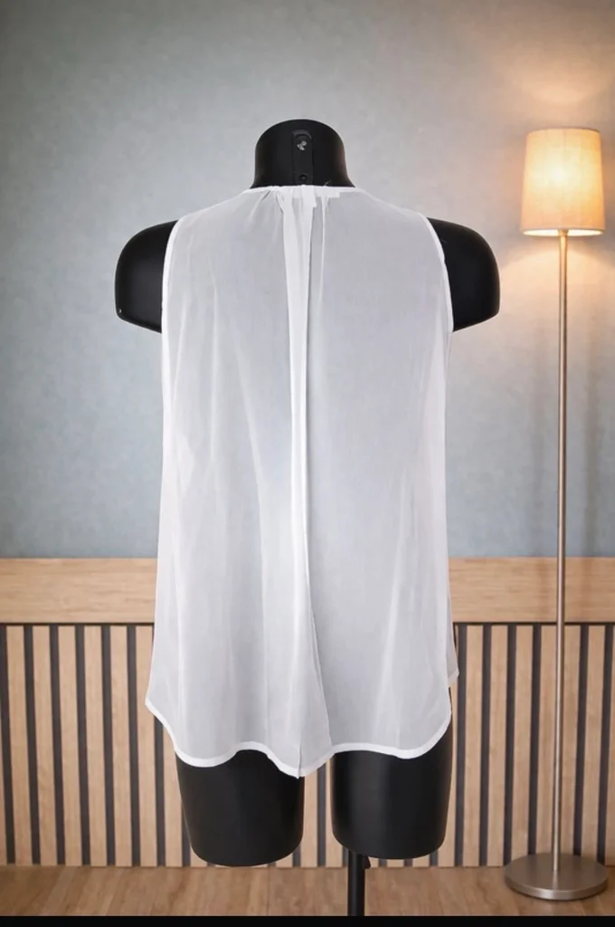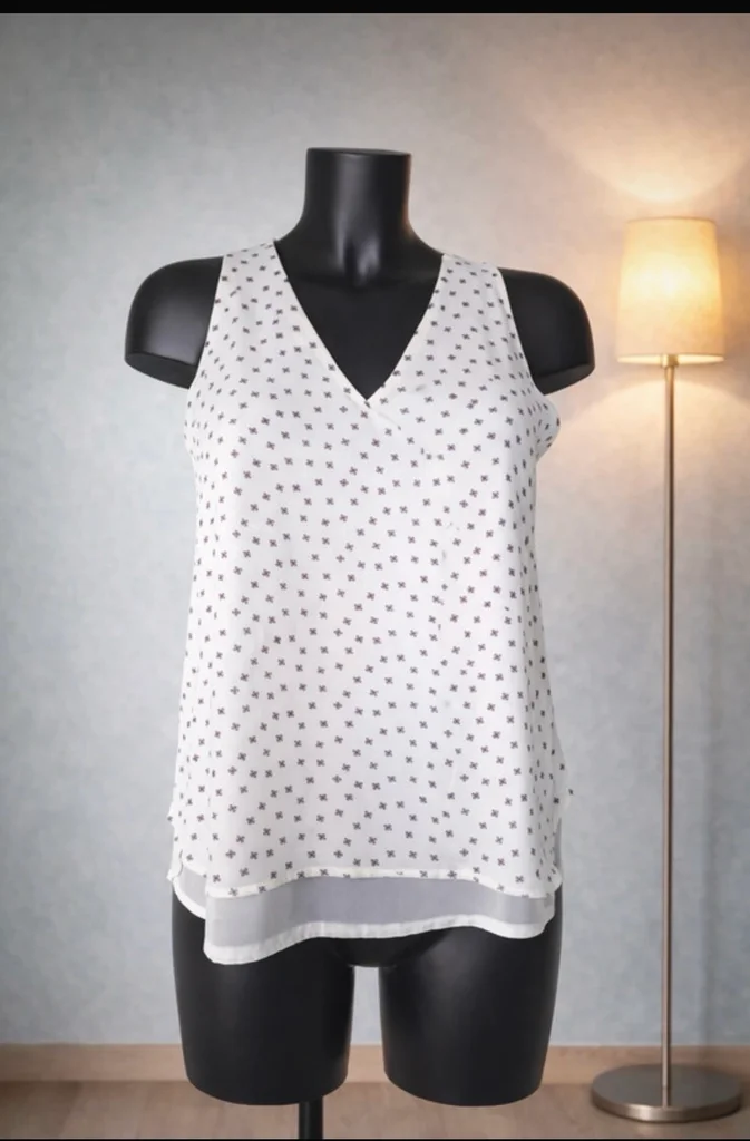 Joli top blanc sans manches de la marque Monogram, avec de petits motifs délicats qui apportent une touche originale tout en restant facile à porter 🤍 Coupe fluide et légère, très agréable pour les beaux jours. Le col en V met en valeur le décolleté et le tissu légèrement transparent donne un rendu chic et féminin. 📏 Détails : • Taille : S • Marque : Monogram • Matière : polyester 💡 État : très bon état, aucun défaut Parfait avec un jean, un short ou une jupe pour un look frais et élégant 🌿 N’hésite pas si tu as des questions ou pour un lot 💌