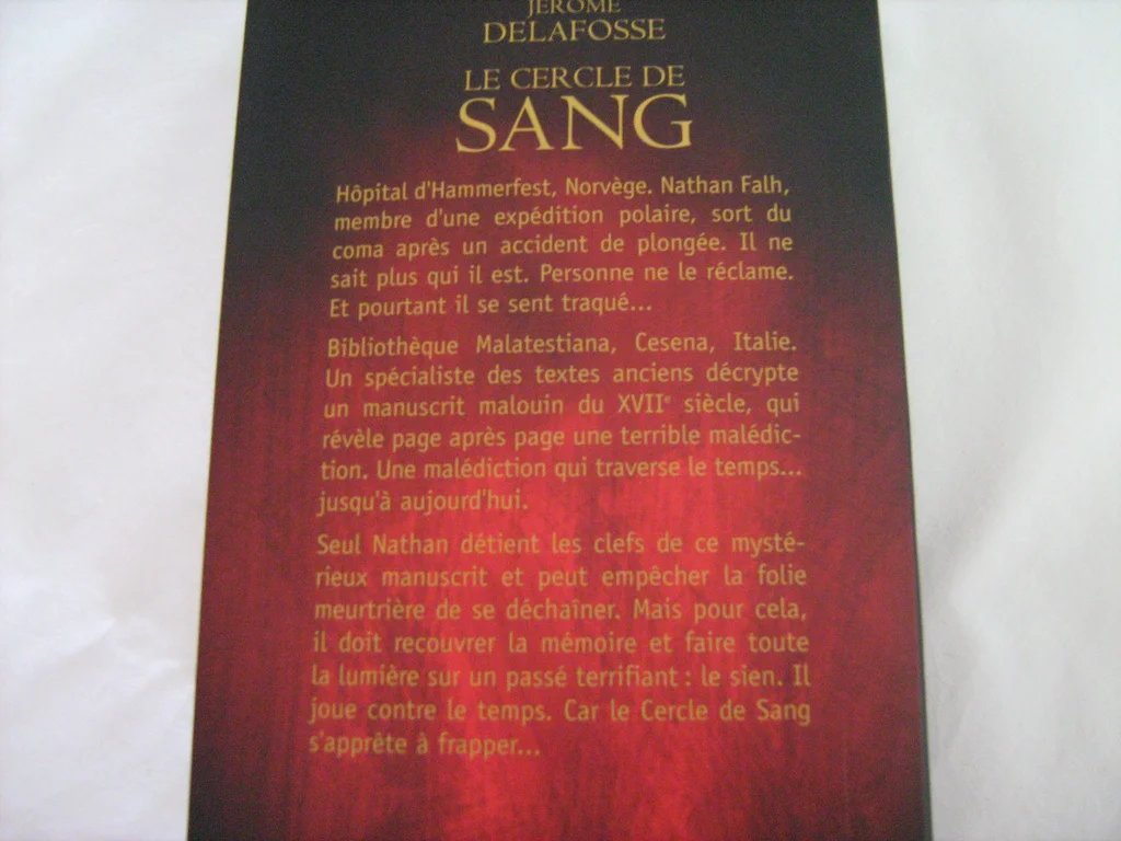 Vends livre le Cercle de Sang de Jérôme Delafosse. Neuf, jamais utilisé. "Hôpital d'Hammerfest, Norvège. Nathan Falh, membre d'une expédition polaire, sort du coma après un accident de plongée. Il ne sait plus qui il est. Personne ne le réclame. Et pourtant il se sent traqué ... Bibliothèque Malatestiana, Cesena, Italie. Un spécialiste des textes anciens décrypte un manuscrit malouin de XVIIème siècle, qui révèle page après page une terrible malédiction. Une malédiction qui traverse le temps ... jusqu'à aujourd'hui. Seul Nathan détient les clés de ce mystérieux manuscrit et peut empêcher la folie meurtrière de se déchaîner. Mais pour cela, il doit recouvrer la mémoire et faire toute la lumière sur un passé terrifiant : le sien. Il joue contre le temps. Car le Cercle de Sang s'apprête à frapper ...". N'hésitez pas à consulter mes autres annonces.