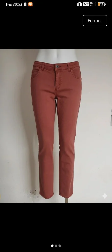 Vends ce joli pantalon en parfait état. Sa couleur terre de sienne (entre le marron brique et le vieux rose) est très tendance et facile à assortir avec du blanc, du beige ou du noir. Coupe : Coupe ajustée très flatteuse. Détails : 5 poches classiques, fermeture bouton et zip. Matière : Tissu légèrement stretch, très confortable à porter toute la journée. État :peu porté.