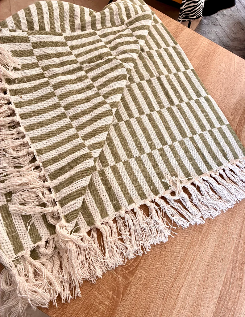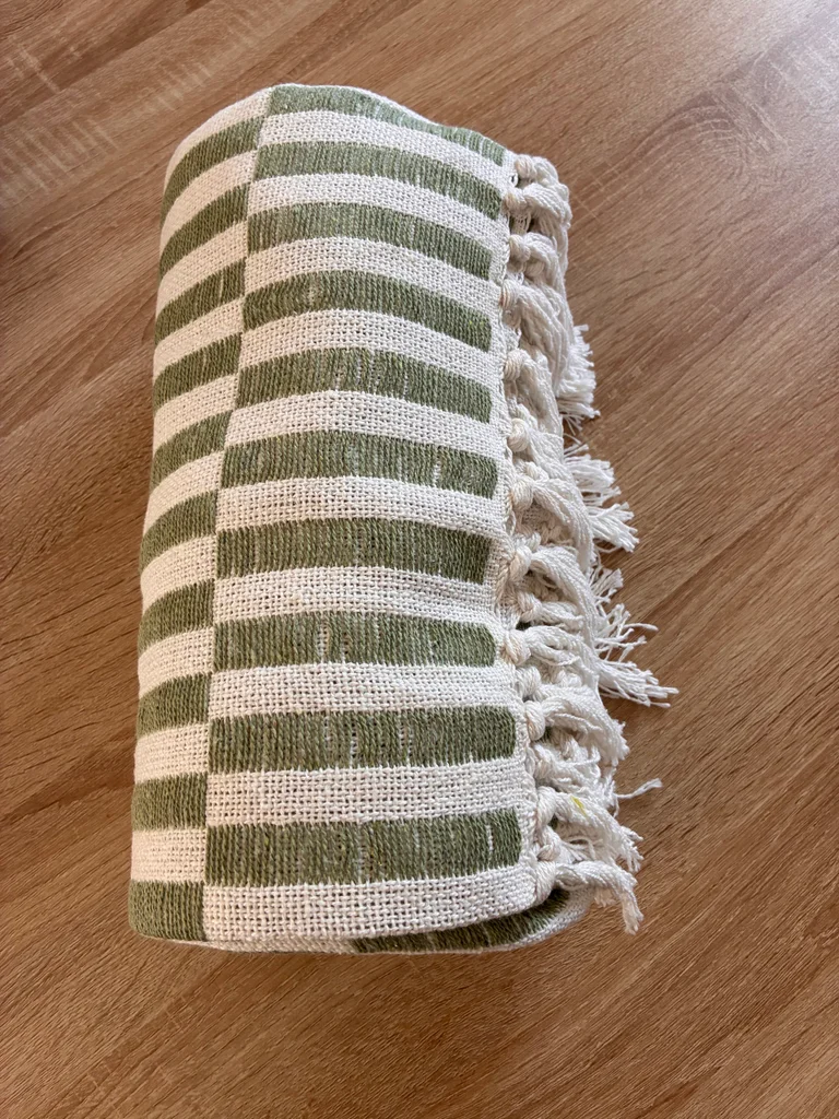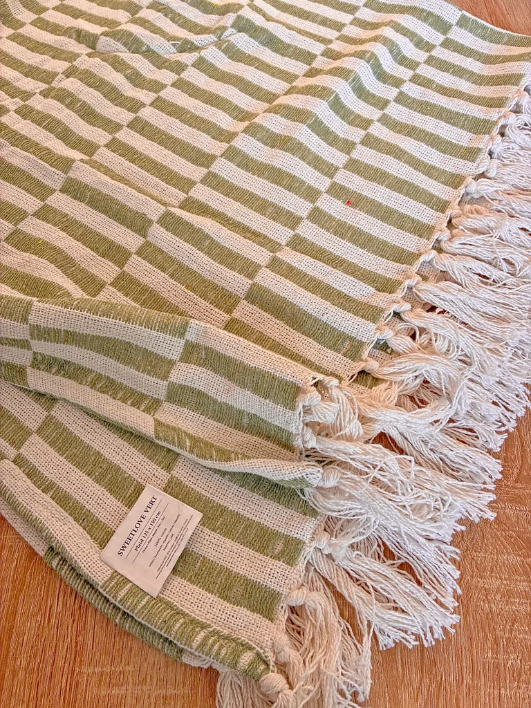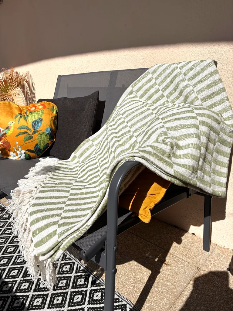 🌿 Plaid 100% Coton - Vert Olive & Crème (Neuf/TBE) Je vends ce superbe plaid de la marque Sweetlove, modèle "Vert". Il possède un design moderne avec un motif de rayures décalées créant un effet damier très tendance. C'est l'accessoire idéal pour apporter une touche bohème chic ou scandinave à votre salon ou votre chambre. • Marque : Sweetlove • Dimensions : 125 x 150 cm (taille parfaite pour un jeté de canapé ou un bout de lit). • Matière : 100% Coton (matière naturelle, douce et respirante). • Couleur : Vert sauge / olive et écru. • Finitions : Jolies franges torsadées faites à la main aux deux extrémités. État : Excellent état, proche du neuf. Étiquette de composition encore présente. Envoi rapide et soigné 🌸😊 (vente cause double emploi)