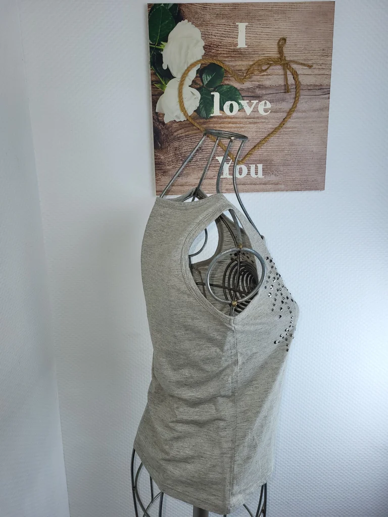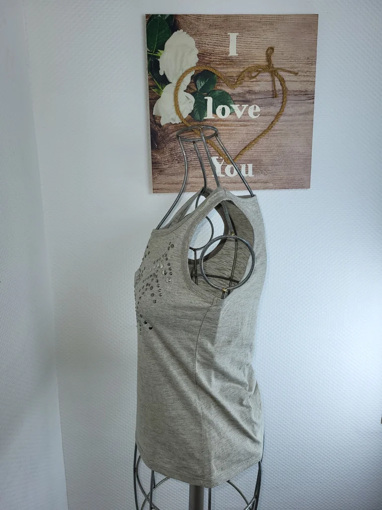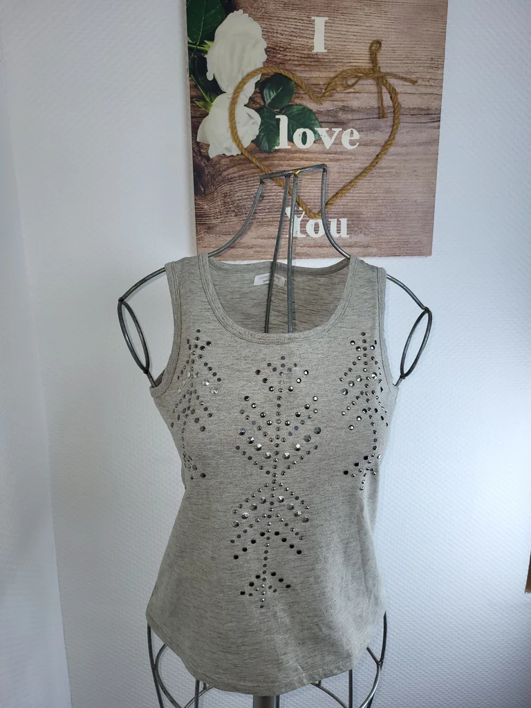 Description : Vends un joli débardeur de la marque Cache Cache, coloris gris clair chiné. Le devant est décoré d'un grand motif géométrique composé de strass et de petites perles argentées qui captent joliment la lumière. Détails : Taille : 38 (M). Coupe : Coupe classique avec décolleté arrondi et larges bretelles. Matière : Maille légère et douce, très confortable. État : Très bon état, tous les strass sont présents. 🚀 LIVRAISON : Envoi via Mondial Relay. Je dépose les colis tous les jours ! ✨ N'hésitez pas à consulter mes autres articles pour créer un lot et économiser sur les frais de port !
