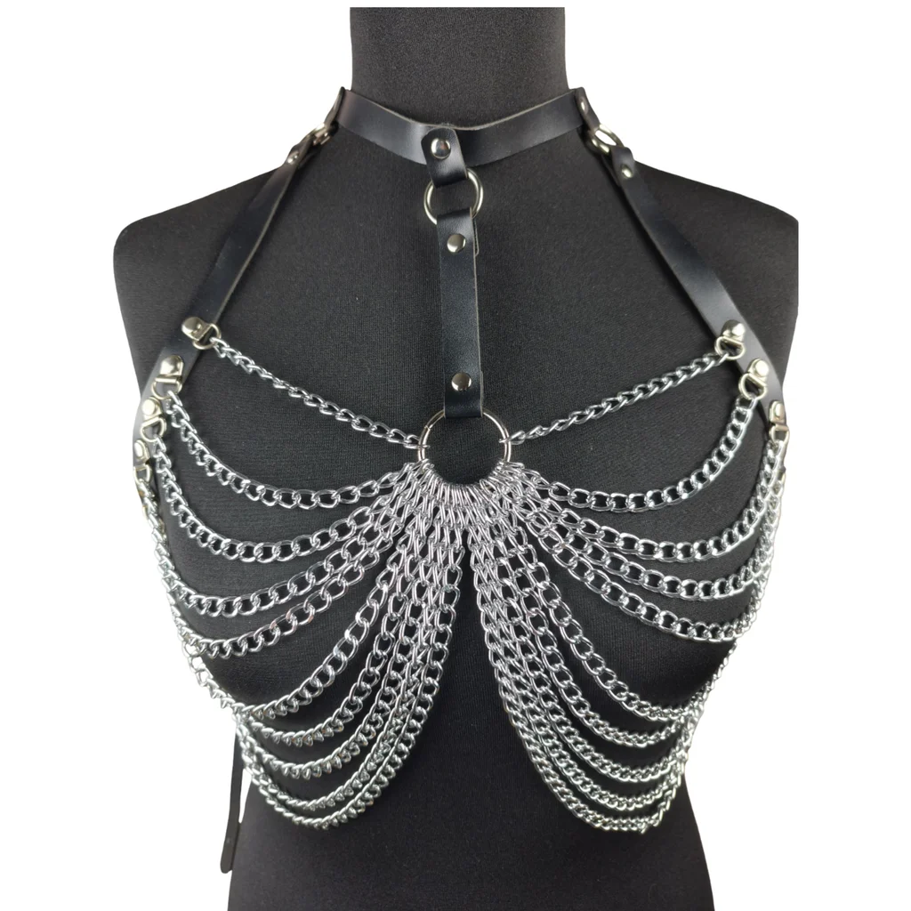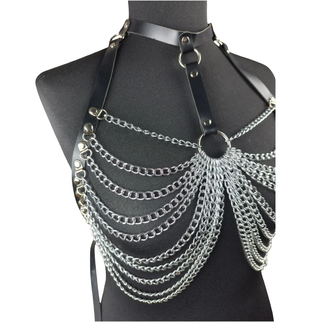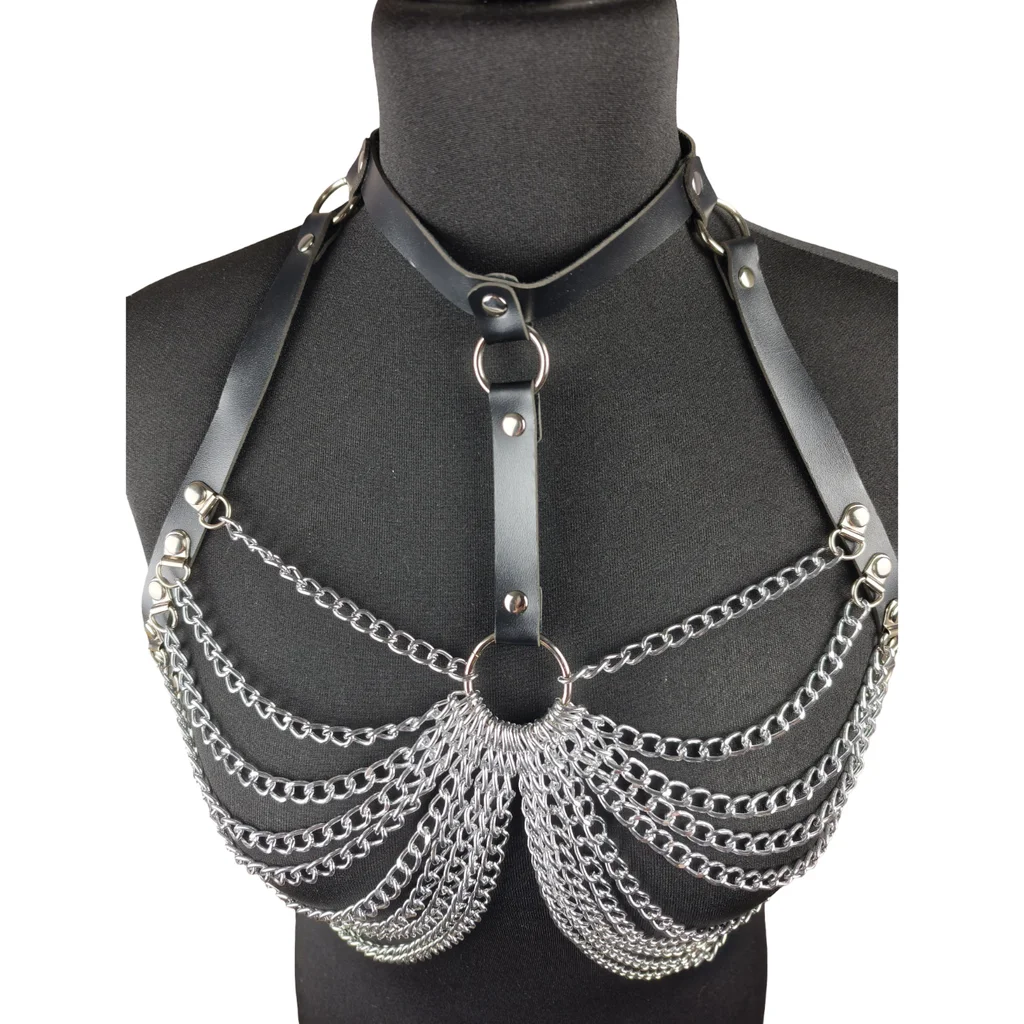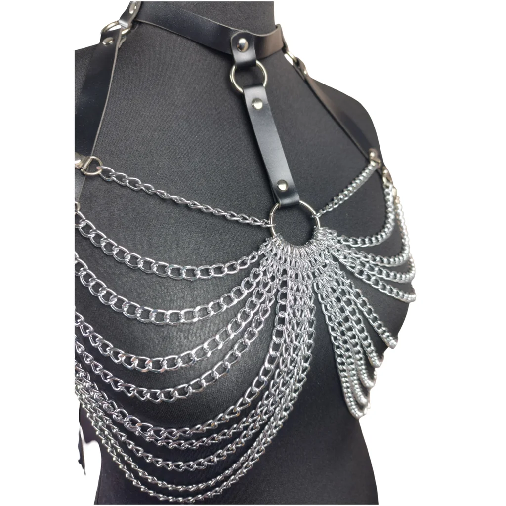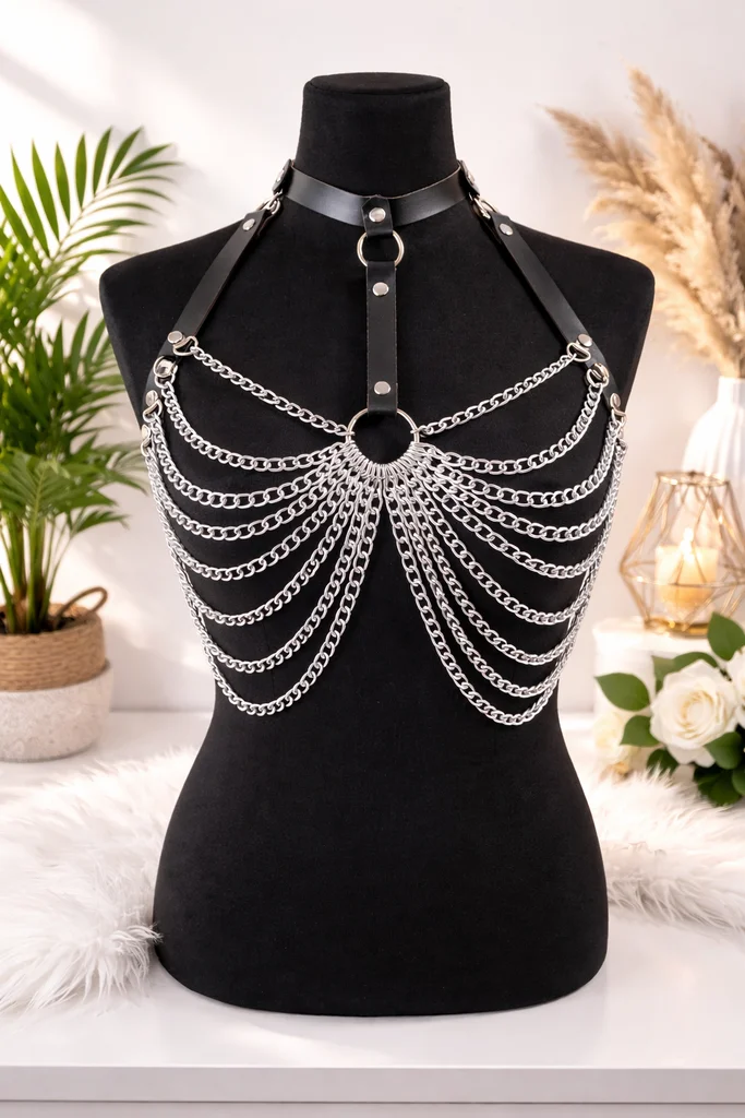 Sublime bijou de buste en simili cuir noir avec multiples chaînes argentées, taille unique réglable. Une pièce ultra tendance qui transforme instantanément une tenue simple en look audacieux et affirmé. Ce harnais est composé d'un tour de cou type choker avec anneau central, bretelles en simili cuir noir et anneaux métalliques décoratifs. Superposition de chaînes argentées effet cascade sur la poitrine. Ceinture réglable à l’arrière et au cou pour un ajustement parfait. Un accessoire au style rock, gothique, alternatif ou glamour audacieux. Il sublime la silhouette et attire immédiatement le regard. Effet visuel spectaculaire, idéal pour personnaliser vos tenues, facile à enfiler et à régler. Avec quoi le porter ? Sur un body noir, par-dessus une robe moulante, avec un crop top ou encore sur un top simple pour upgrader le look... Neuf sous blister. Photos conformes. Taille unique (réglable) Livraison rapide et soignée.