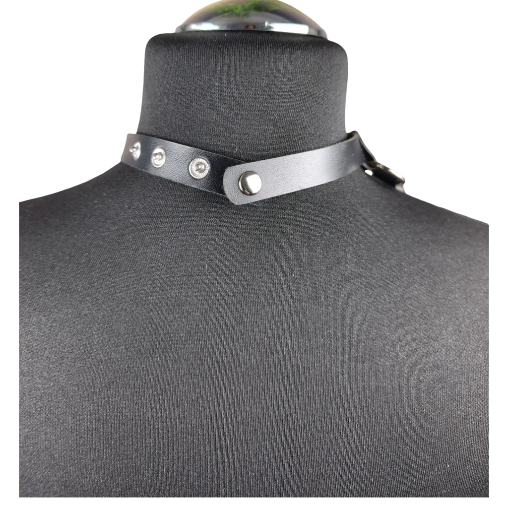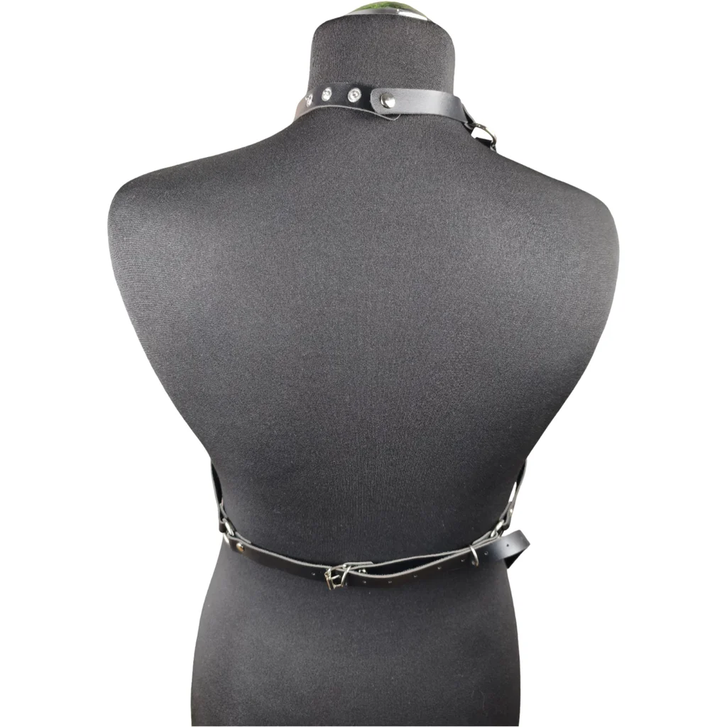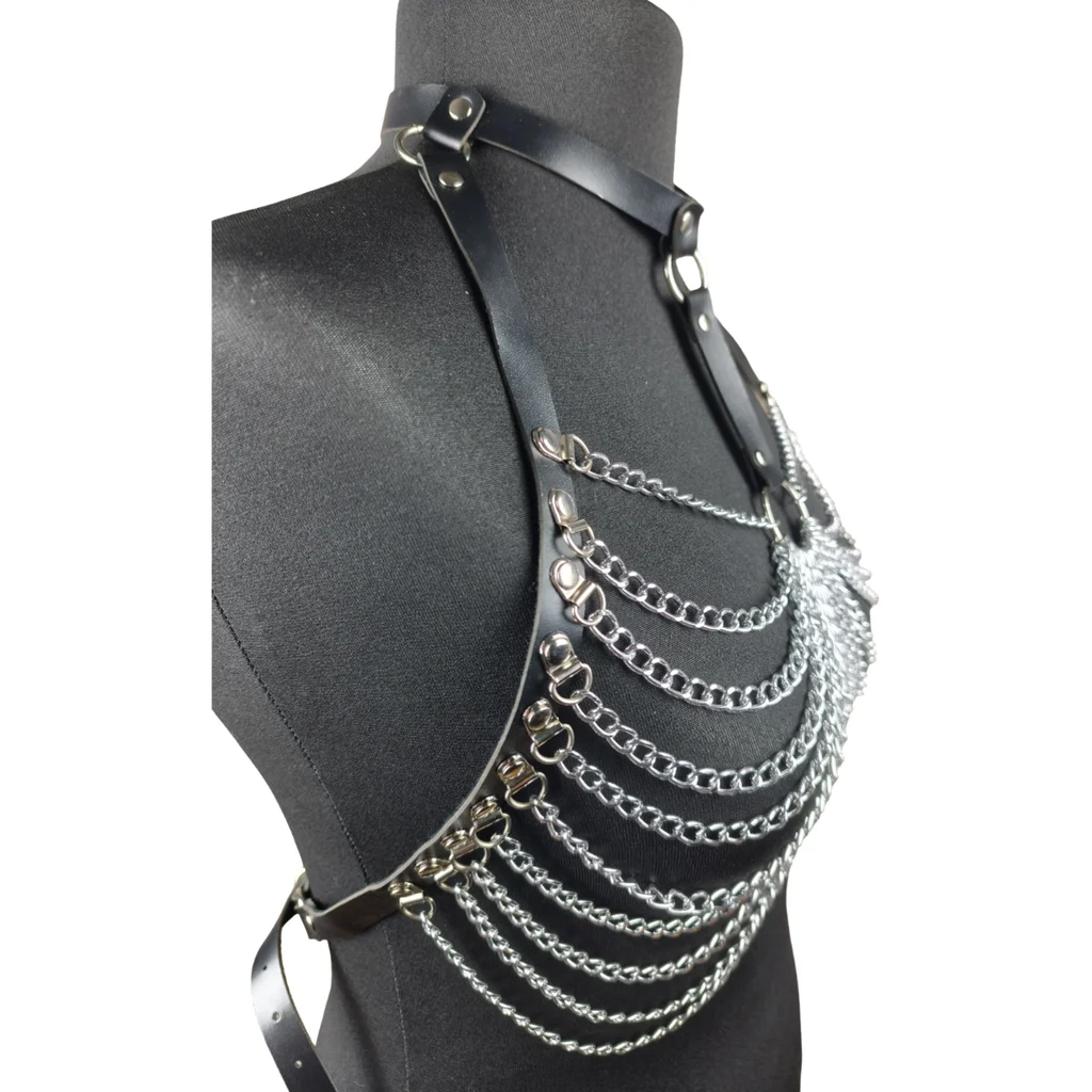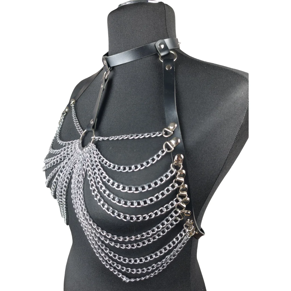 Sublime bijou de buste en simili cuir noir avec multiples chaînes argentées, taille unique réglable. Une pièce ultra tendance qui transforme instantanément une tenue simple en look audacieux et affirmé. Ce harnais est composé d'un tour de cou type choker avec anneau central, bretelles en simili cuir noir et anneaux métalliques décoratifs. Superposition de chaînes argentées effet cascade sur la poitrine. Ceinture réglable à l’arrière et au cou pour un ajustement parfait. Un accessoire au style rock, gothique, alternatif ou glamour audacieux. Il sublime la silhouette et attire immédiatement le regard. Effet visuel spectaculaire, idéal pour personnaliser vos tenues, facile à enfiler et à régler. Avec quoi le porter ? Sur un body noir, par-dessus une robe moulante, avec un crop top ou encore sur un top simple pour upgrader le look... Neuf sous blister. Photos conformes. Taille unique (réglable) Livraison rapide et soignée.