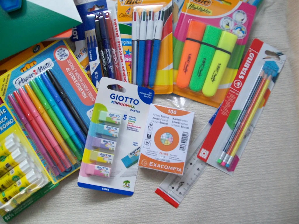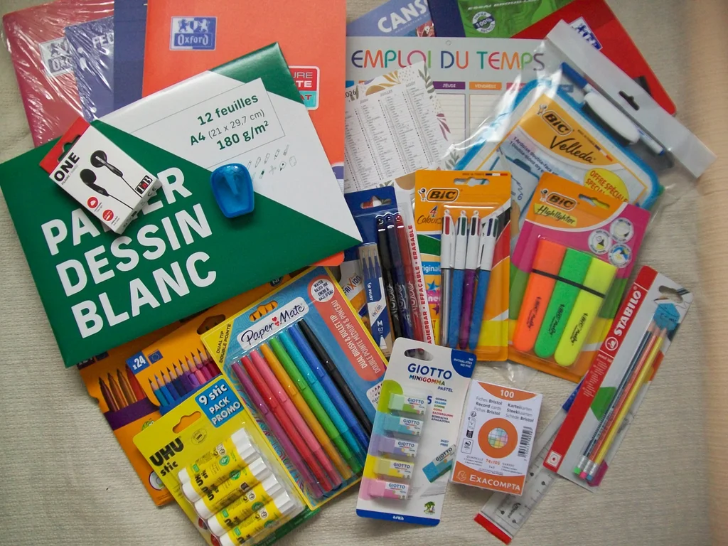 Lot papeterie et fournitures scolaires comprenant : - 1 lot 3 rollers frixion ball + 3 recharges Pilot - 1 lot 4 stylos-bille 4 couleurs Bic - 1 lot 4 cahiers Openflex 24x32cm 96 pages Oxford - 1 cahier OpenFlex 21x29,7cm 96 pages Oxford - 1 lot 24 feutres de coloriage Bic - 1 lot 24 crayons de couleur Bic - 1 lot 9 bâtons de colle 8g UHU - 1 lot 8 feutres d'écriture Flair double pointe Paper Mate - 1 bloc-notes A4 petits carreaux 200 pages Conquérant - 1 paquet 100 feuillets mobiles perforées A4 grands carreaux Calligraphe - 1 pochette 12 feuilles A4 papier à dessin blanc 180g Clairefontaine - 1 emploi du temps multicolore 29,5 x 22cm Exacompta - 1 calendrier rigide 13 x 18cm septembre à septembre - 1 cahier 17 x 22cm grands carreaux 96 pages Oxford - 1 cahier de brouillon 17 x 22 cm grands carreaux 48 pages Calligraphe - 1 cahier de dessin 17 x 22 cm 32 pages 120g Canson - 1 carnet 11 x 17 cm petits carreaux 96 pages Conquérant - 1 ardoise blanche double face 19 x 26 cm + 5 marque [Description tronquée]