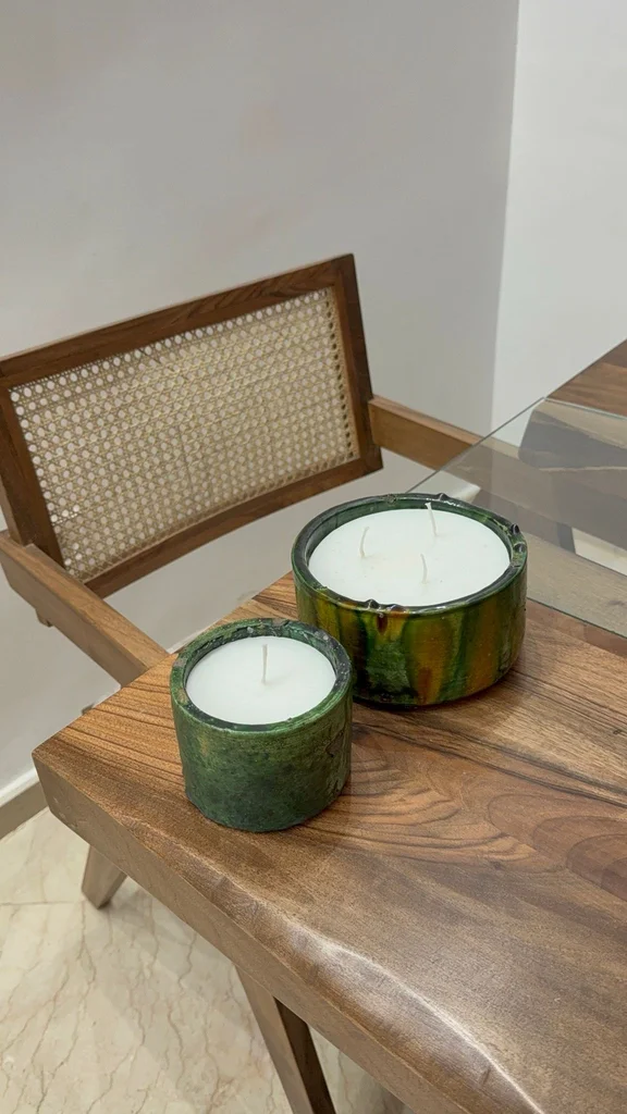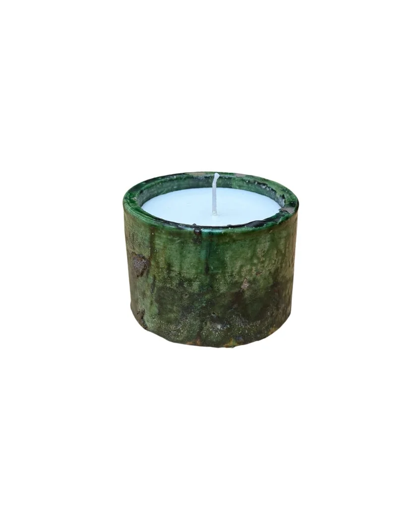 Bougie artisanale en pot de Tamegroute vert, façonnée à la main, avec 1 mèche pour une diffusion chaleureuse et homogène. Coulée en cire de soja, elle offre une combustion propre et durable. Disponible en plusieurs senteurs : - fleur d'oranger - ambre-vanille - orange-cannelle - Natus d'Orient (mélange envoûtant de cannelle, oud, musc et fleur d'oranger) mon préféré Parfaite pour créer une ambiance cozy et élégante, ou pour offrir un cadeau à la fois authentique et raffiné.
