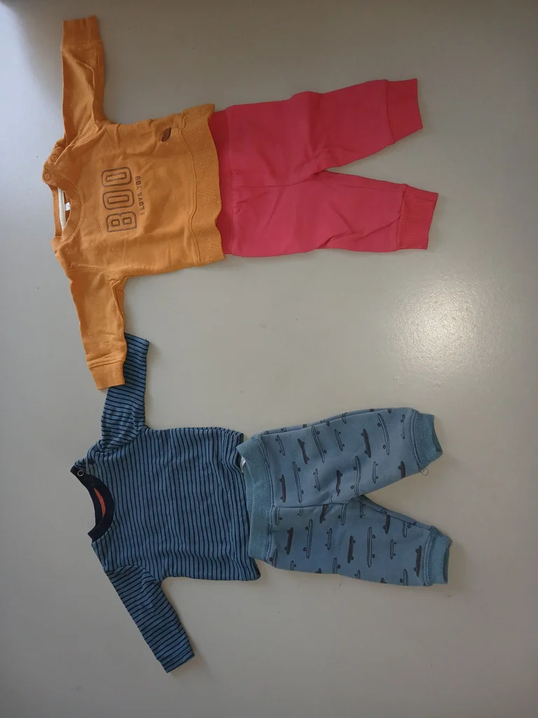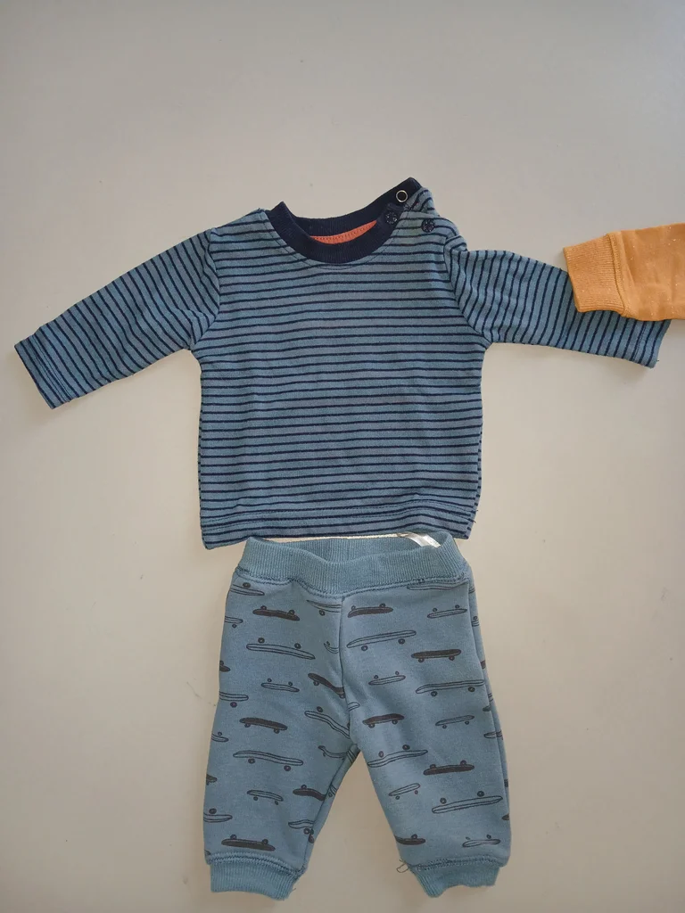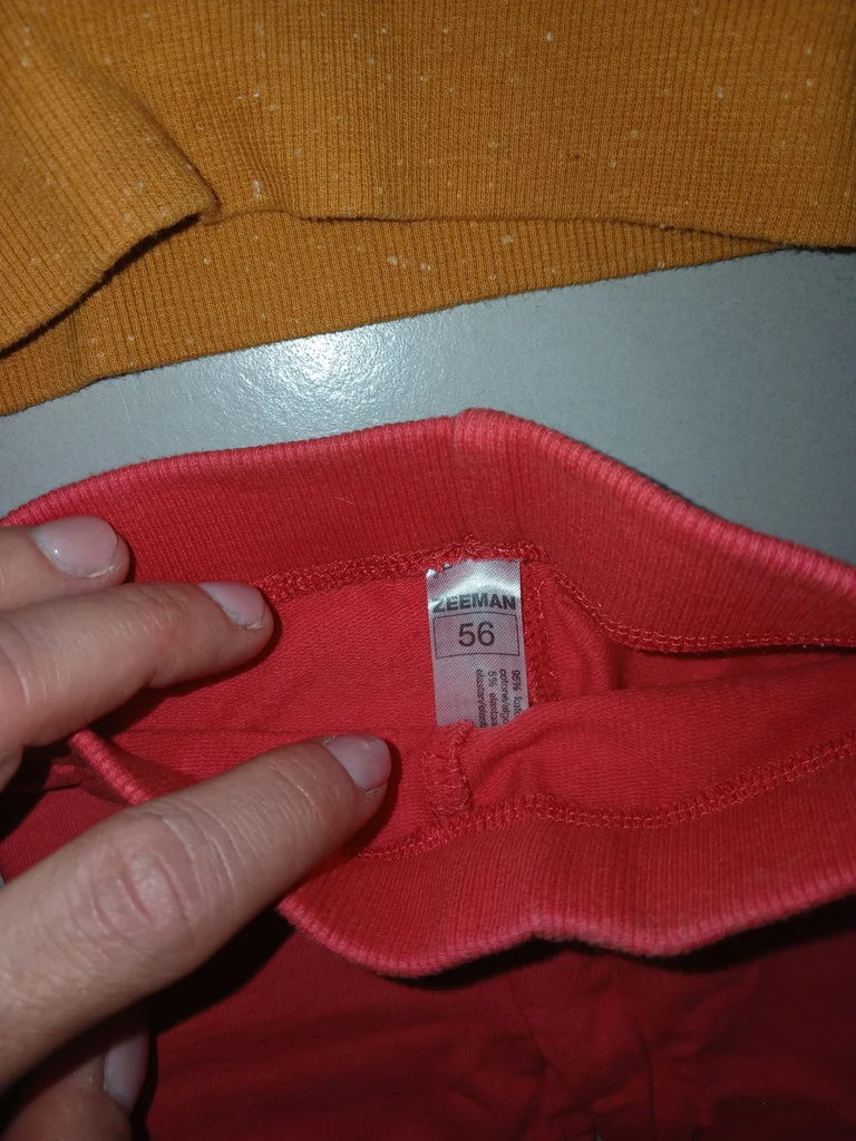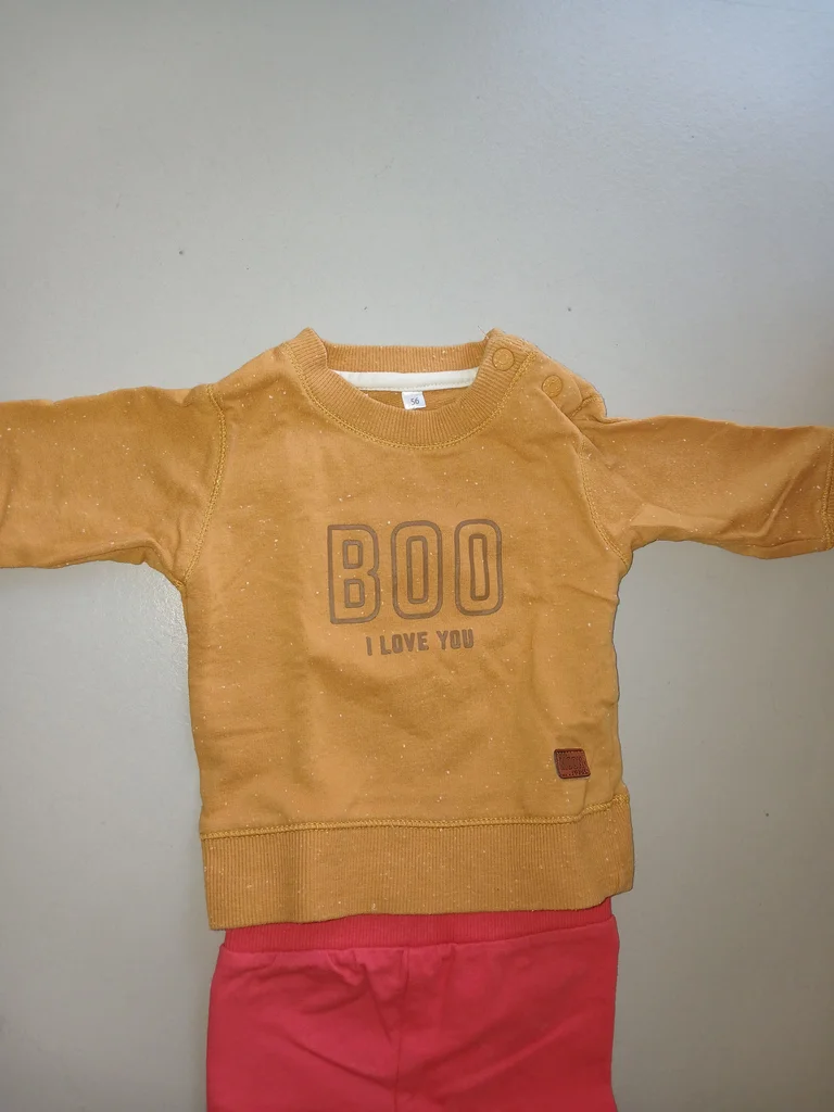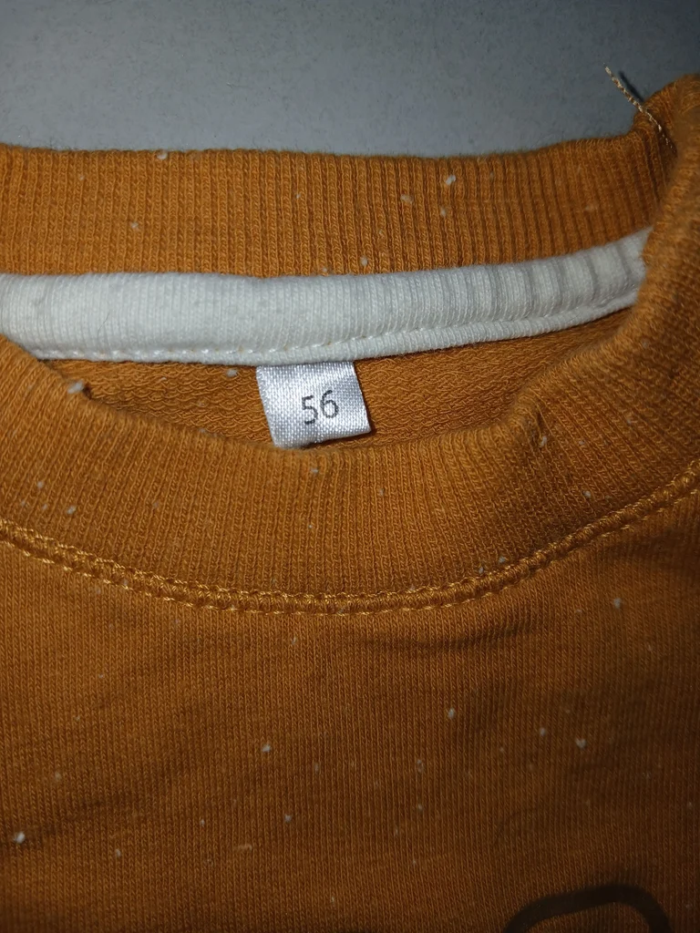 Très bon état car très peu portés (2 fois peut etre),propre ,le pull moutarde est moucheté blanc