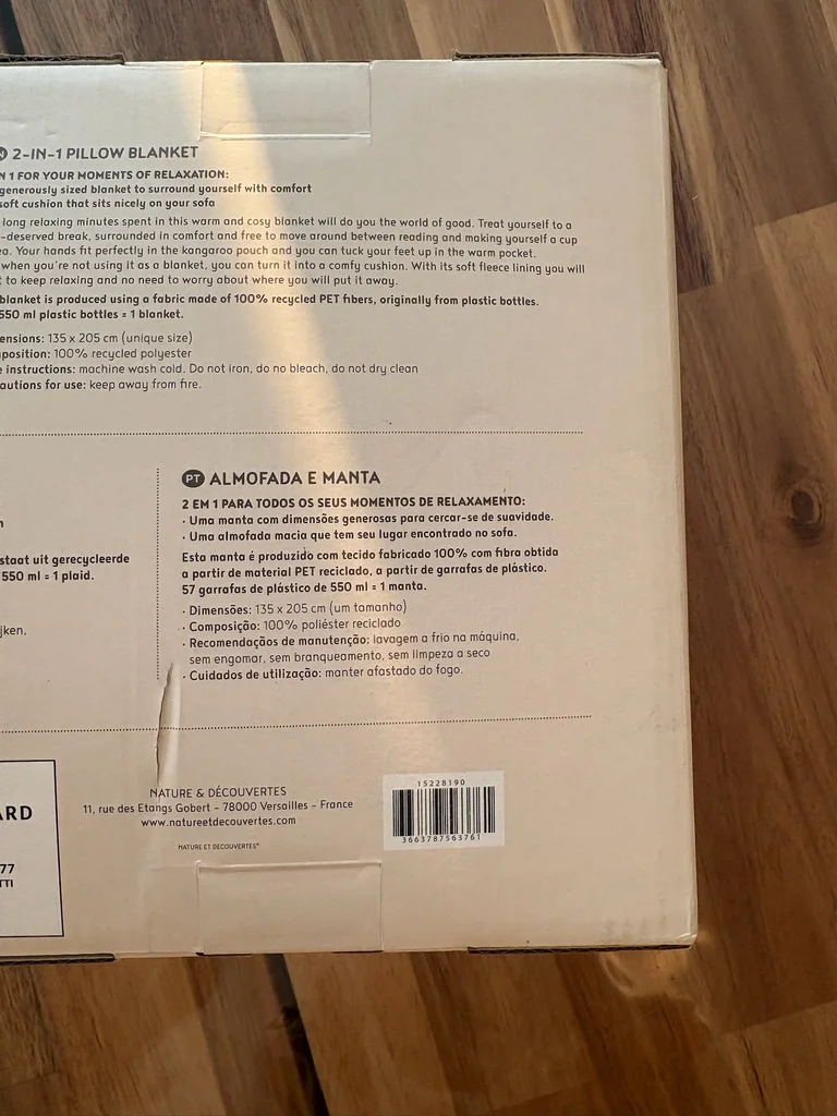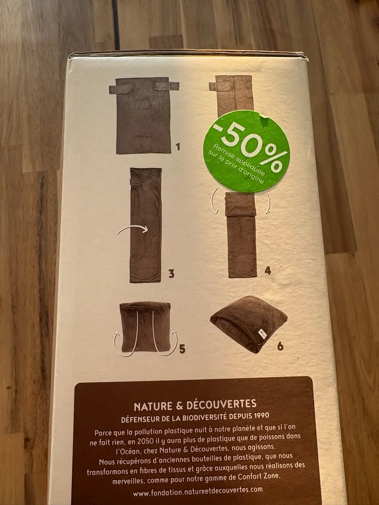 "coussin / plaid 135x205 cm polyester recyclé marron nature & découvertes Offrez-vous un véritable cocon de douceur avec ce plaid ingénieux qui se transforme en coussin moelleux. Parfait pour vos moments de détente, il vous enveloppe chaleureusement tout en restant pratique grâce à ses détails pensés pour le confort, comme la poche kangourou et le rabat pour les pieds. composition : 100% polyester recyclé dimensions : 135 x 205 cm couleur : marron utilisation : plaid transformable en coussin détails : rabat pour les pieds, poche kangourou pour les mains particularité : fibre issue de bouteilles en plastique recyclées rangement : livré avec pochette de compression entretien : facile d’entretien Un allié idéal pour vos moments cocooning à la maison."