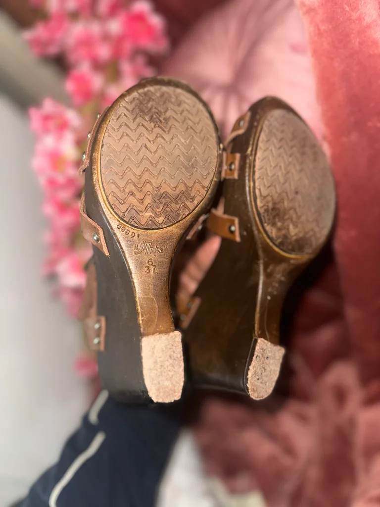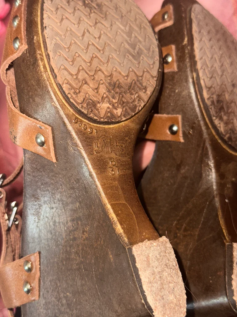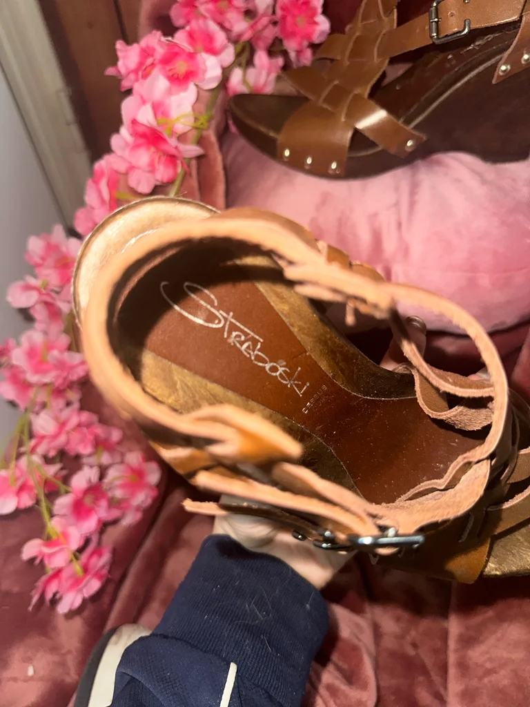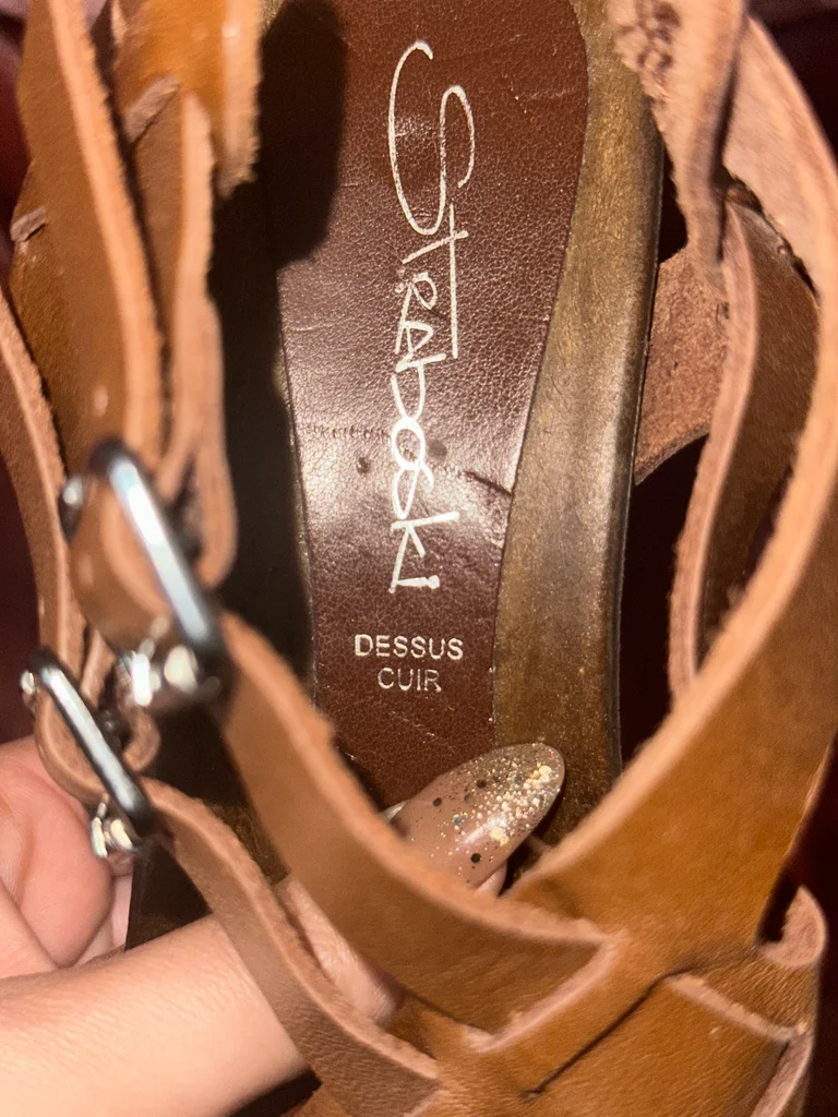 -Magnifique paire de talons en cuir, de couleur marron, compensés, avec doubles brides réglables qui tient la cheville, très confortable. -pointure: 37 -marque: Straboski -en très très bon état, déjà portée, parfait pour une seconde main, 100% confort et qualité.