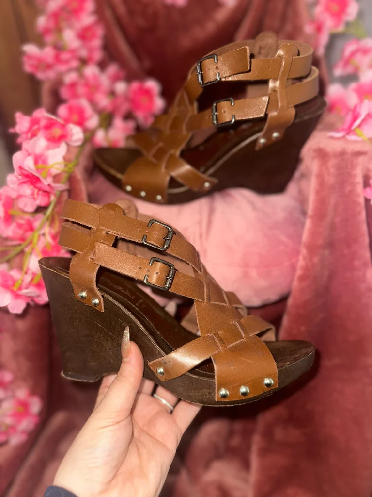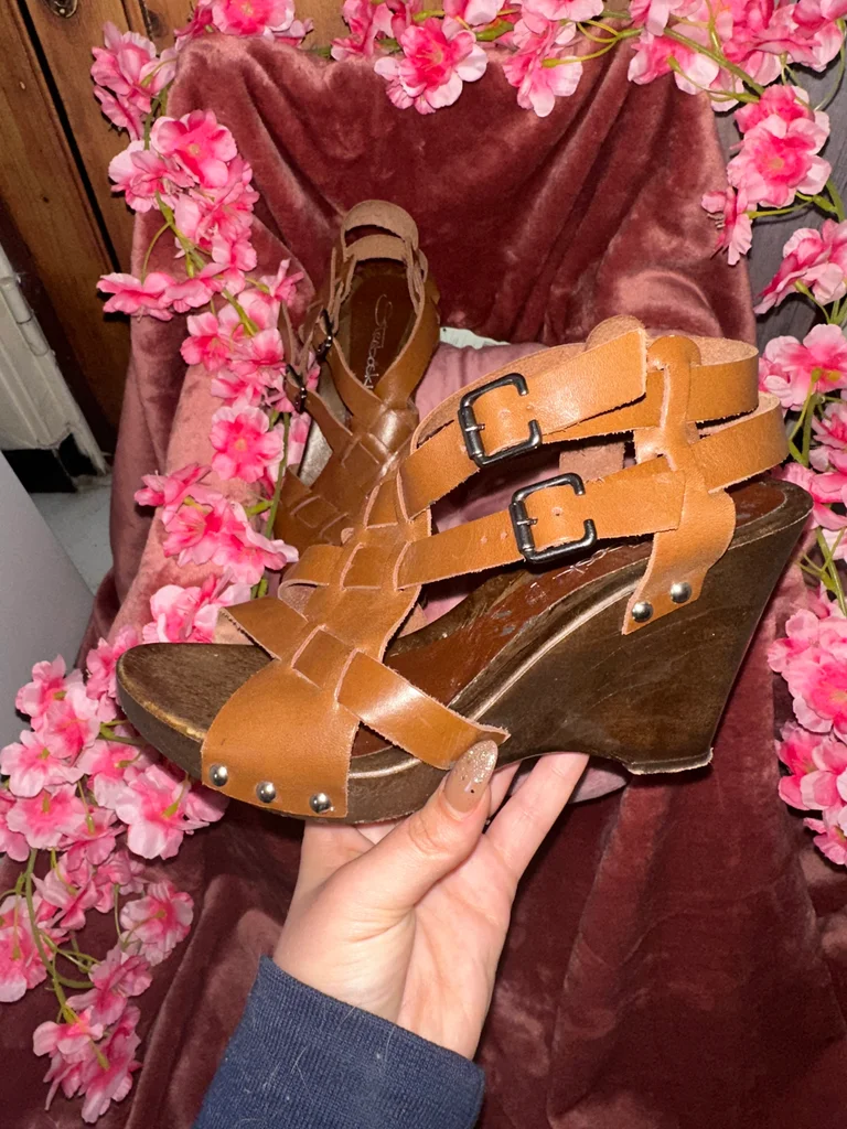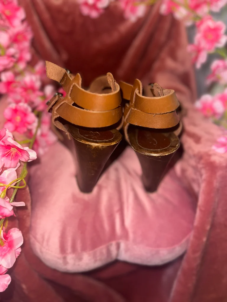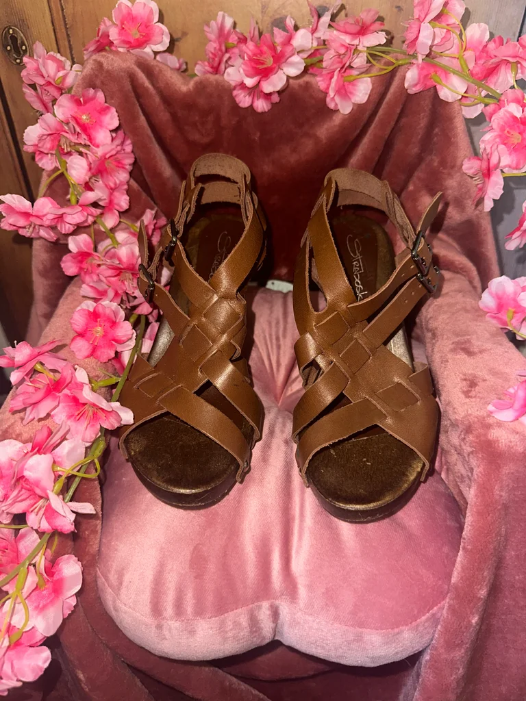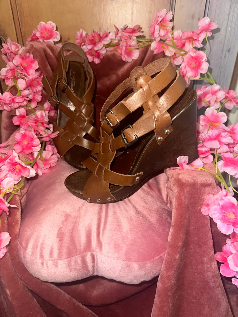 -Magnifique paire de talons en cuir, de couleur marron, compensés, avec doubles brides réglables qui tient la cheville, très confortable. -pointure: 37 -marque: Straboski -en très très bon état, déjà portée, parfait pour une seconde main, 100% confort et qualité.