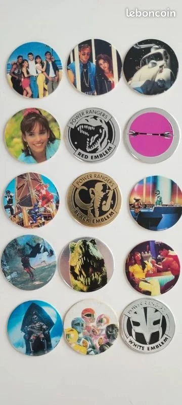 lot de 15 pogs de la série Mighty Morphin Power Rangers (années 90) - Inclut des modèles métalliques "Emblem" : Ranger Blanc (argenté), Ranger Noir (doré), Ranger Rouge (argenté avec logo Tyrannosaure) - Les autres pogs présentent des illustrations des Rangers et des scènes de la série - État bon : couleurs préservées, pas de dommages majeurs Idéal pour les fans de la série ou les collectionneurs de pogs rétro !