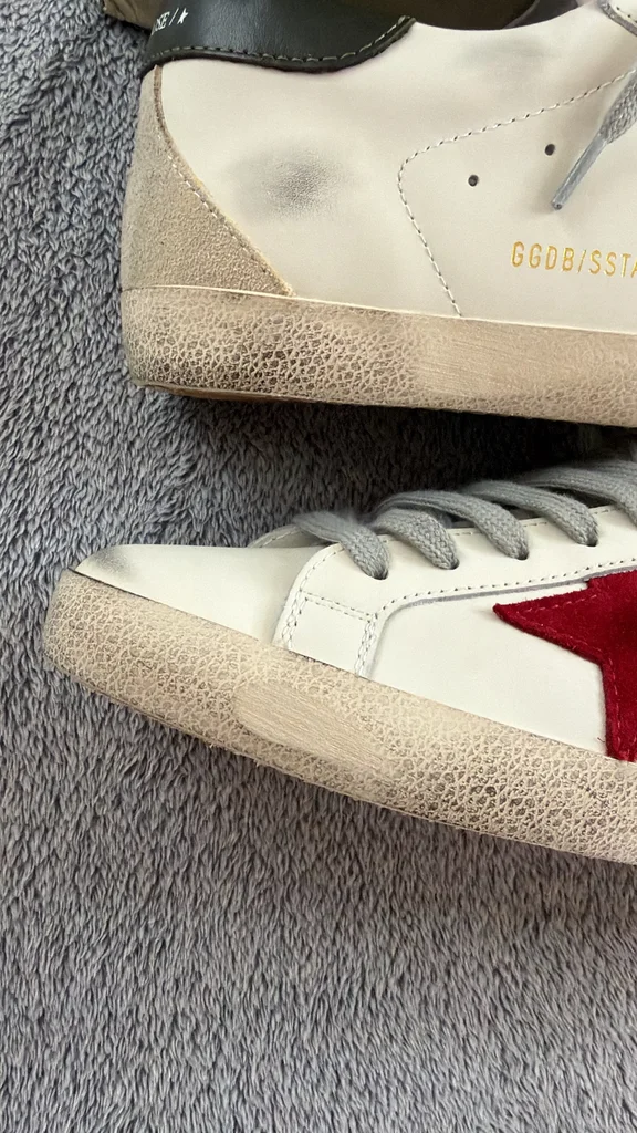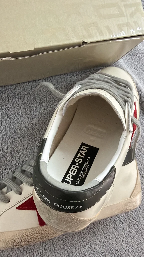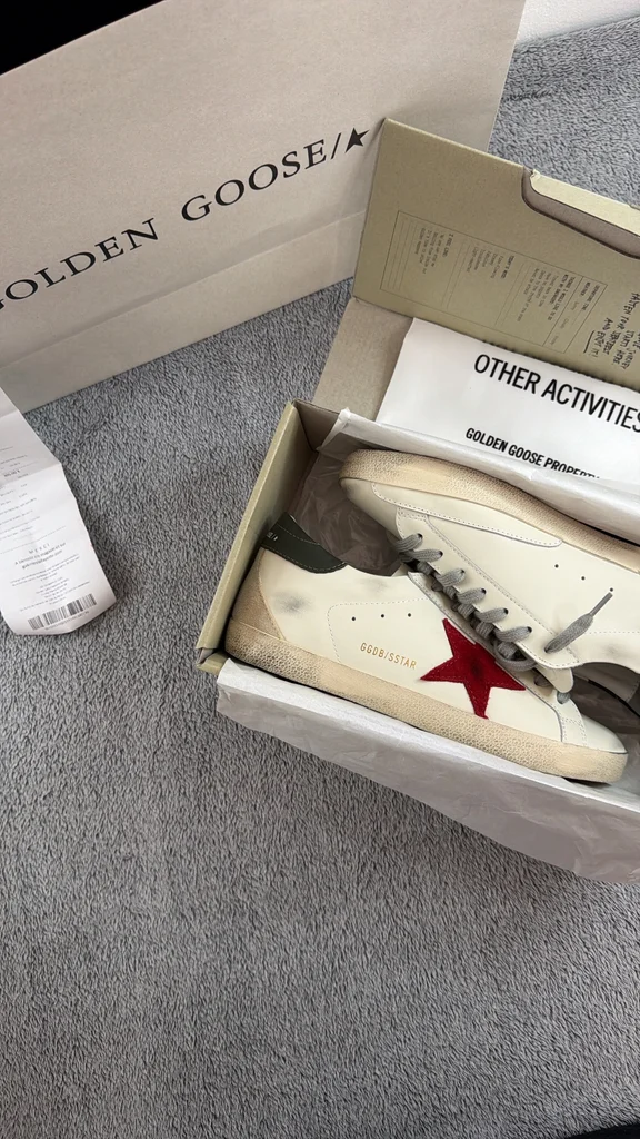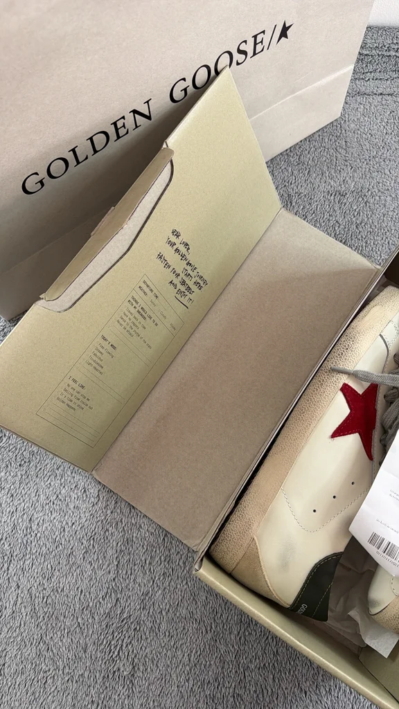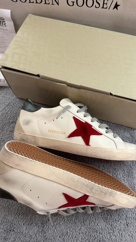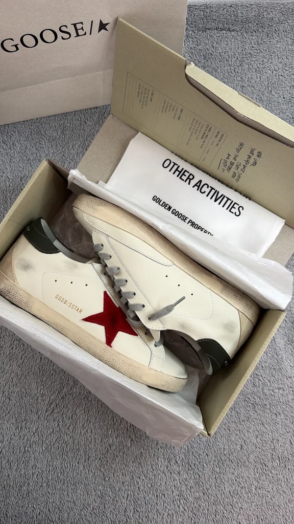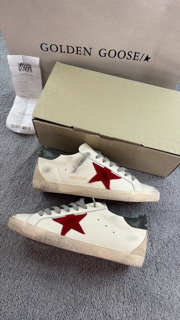 Je vends une paire de Golden Goose Super-Star en taille 42. Modèle iconique avec étoile rouge, finition effet “vintage” typique de la marque. ✔️ État : neuves, jamais portées ✔️ Taille : 42 ✔️ Couleur : blanc avec étoile rouge et détails verts ✔️ Vendues avec : boîte d’origine + dust bag Parfaites pour un look casual chic avec une touche premium. Prix neuf élevé en boutique. N’hésitez pas à me contacter pour plus d’infos ou photos !