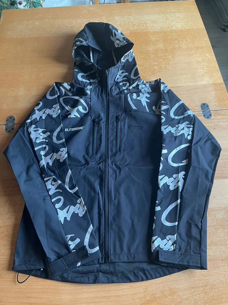 Veste Corteiz Elitework – Alcatraz Jacket Taille : L Coloris : Noir / Argent réfléchissant Print graffiti Corteiz script all-over Logo Elitework brodé poitrine Capuche intégrée ajustable Zip central + poches zippées Matière coupe-vent technique Cordon élastique bas de veste Drop limité Corteiz 🔥 État : Très bon état ✅