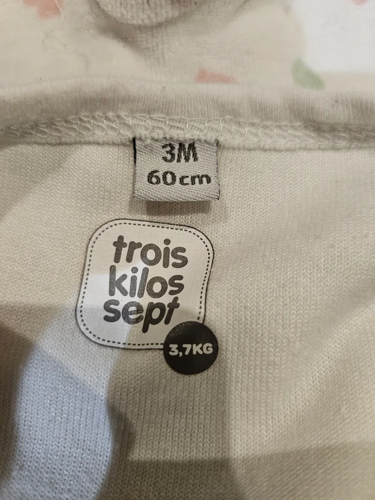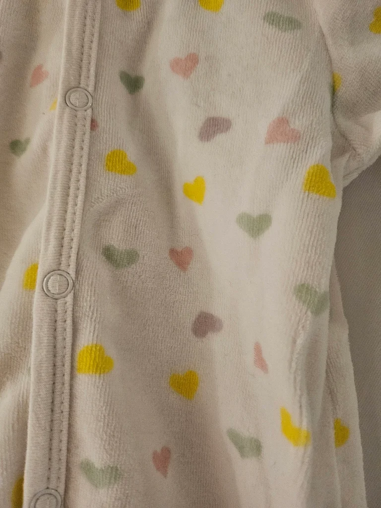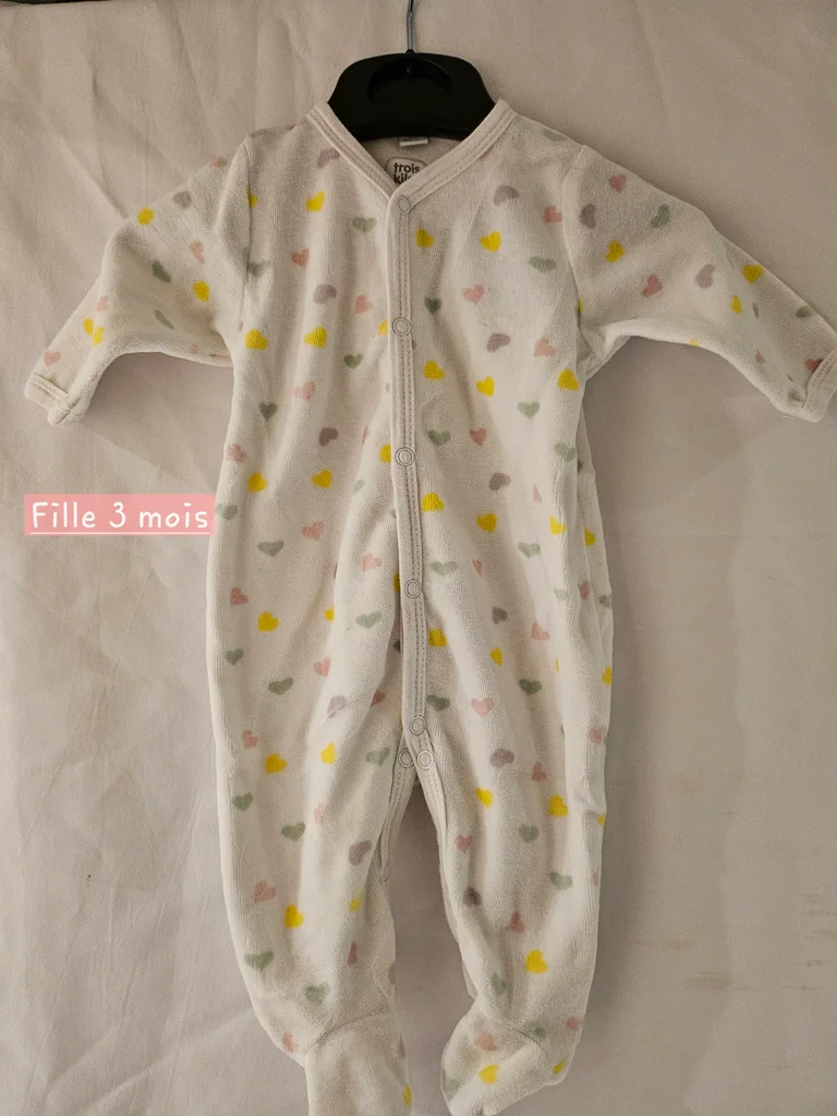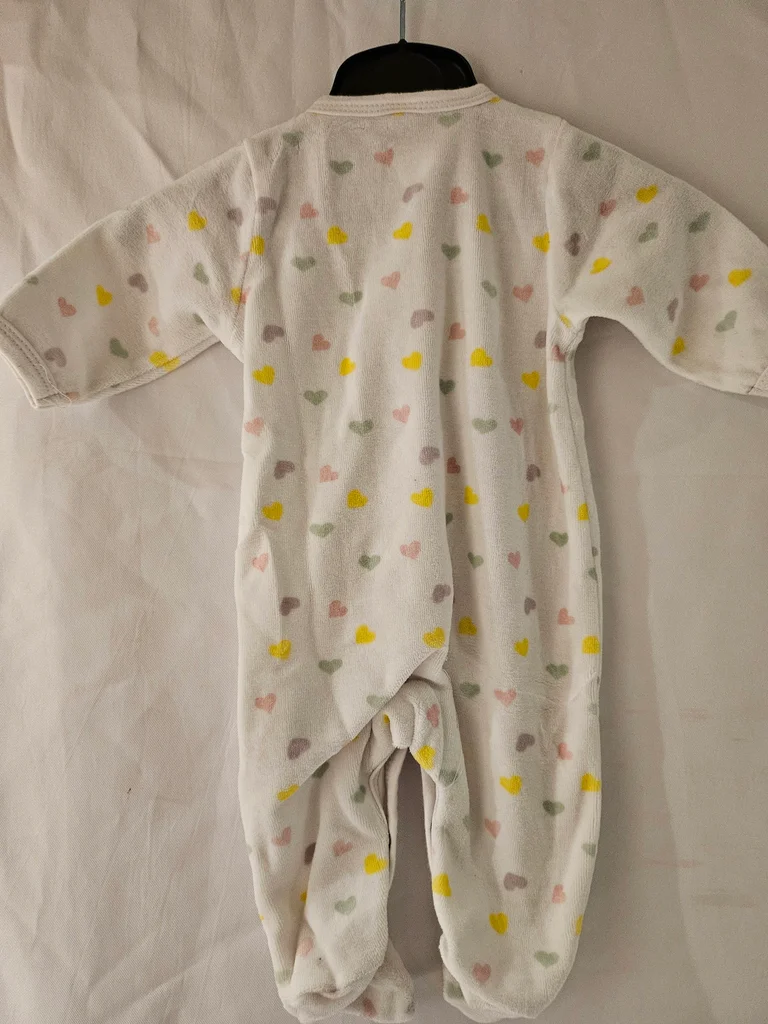 Pyjama en velours blanc avec cœurs multicolores. Ouverture devant par pressions. Marque: 3 kilos 7 Taille: 3 mois