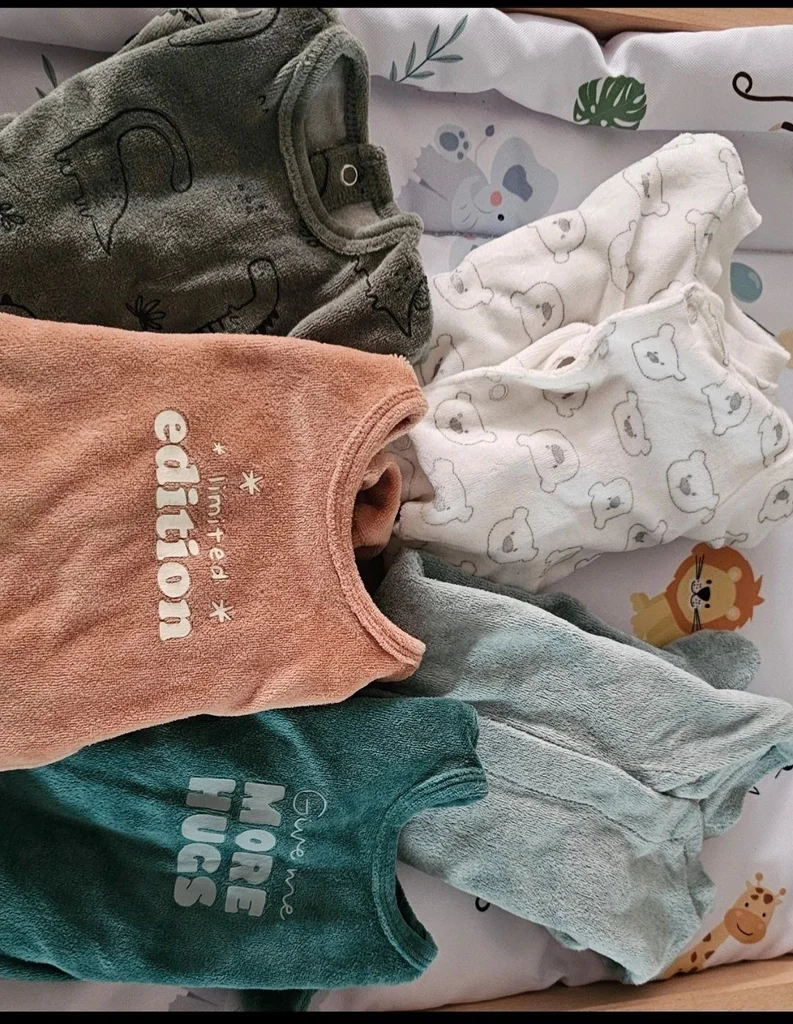 Pyjamas taille 1 mois, deux pyjamas s'ouvrent par devant et trois s'ouvrent dans le dos. Marque - nookies, zeeman, kiabi . Matière : coton et polyester