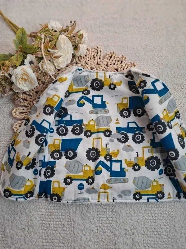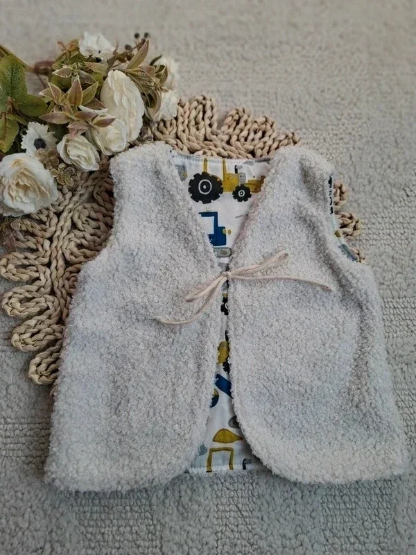 gilet berger 3/4 ans camion de chantier - Gilet berger réversible taille 3/4 ans Petits liens à nouer 🎀 - Dimension largeur sous le bras 30 cm environ hauteur 34 cm environ - Composition tissu bouclette 100 % polyester et tissu doublure 100 % coton - Lavage en machine à 30 °