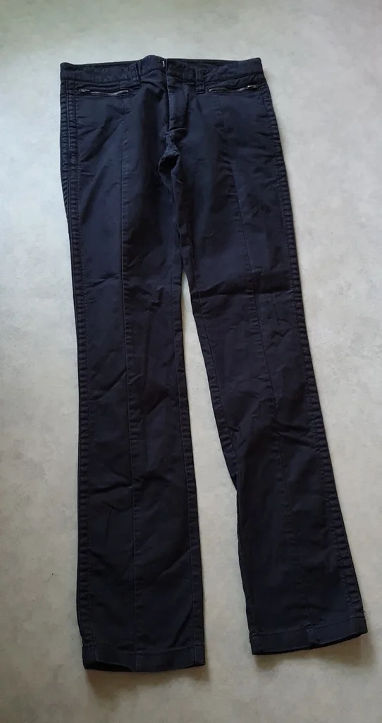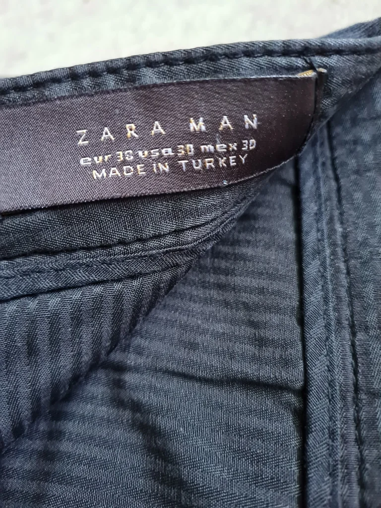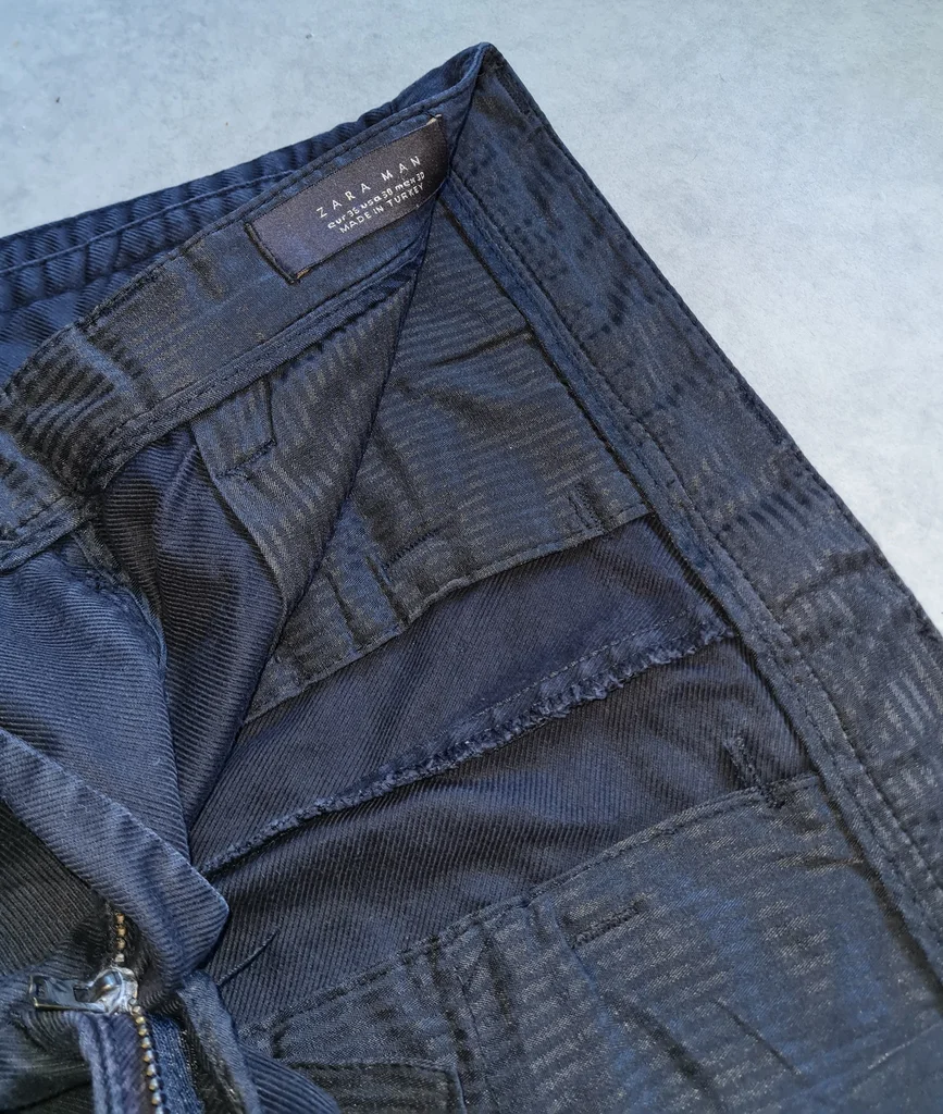ZARA MAN jean noir intérieur haut tissu rayure poches devant fermeture éclair poches arrières à boutons fermeture crochet + fermeture éclair couture en longueur sur le milieu des jambes entre jambe / taille 24cm tour de taille 80cm longueur 108cm bas de jambes 19cm #lesplacardsenfoliehomme #lesplacardsenfolietailleM ref17