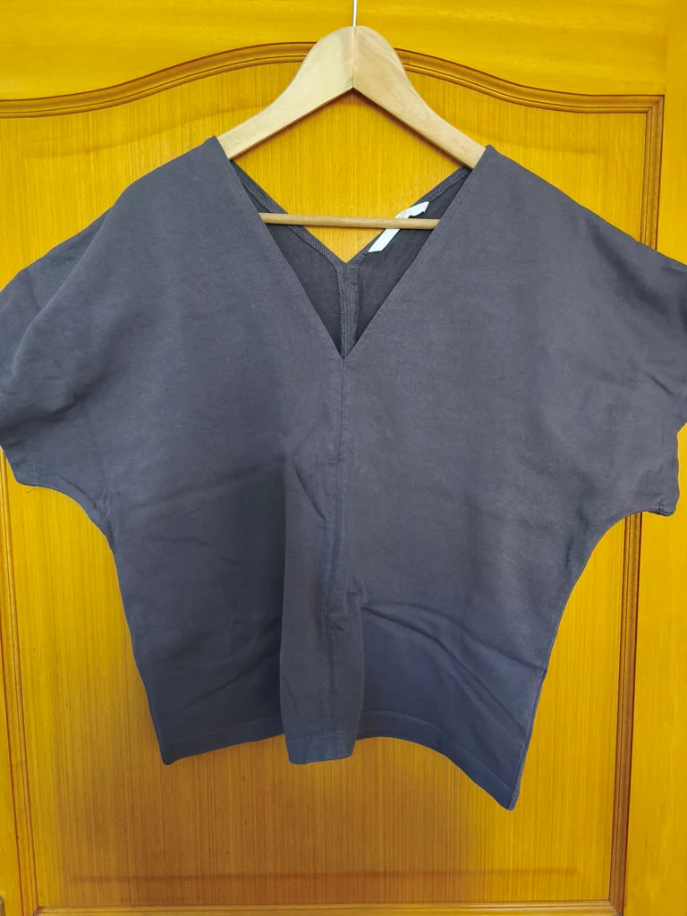 Très joli haut gris en coton de chez Zara, taille S format kimono a manches courtes et larges. Le Col en V est très ouvert derrière. Parfait avc un débardeur Blanc en dessous. Porté large. 100 % coton Il date du printemps dernier. Porté une ou deux fois. Comme neuf Je vends également le pantalon fluide qui va avec