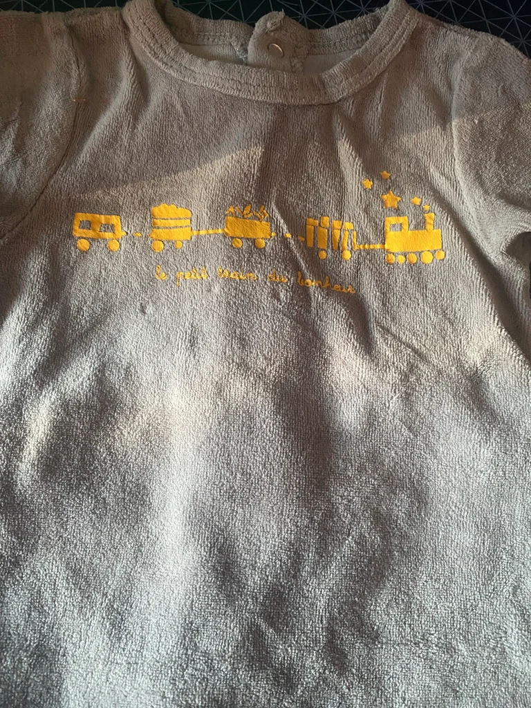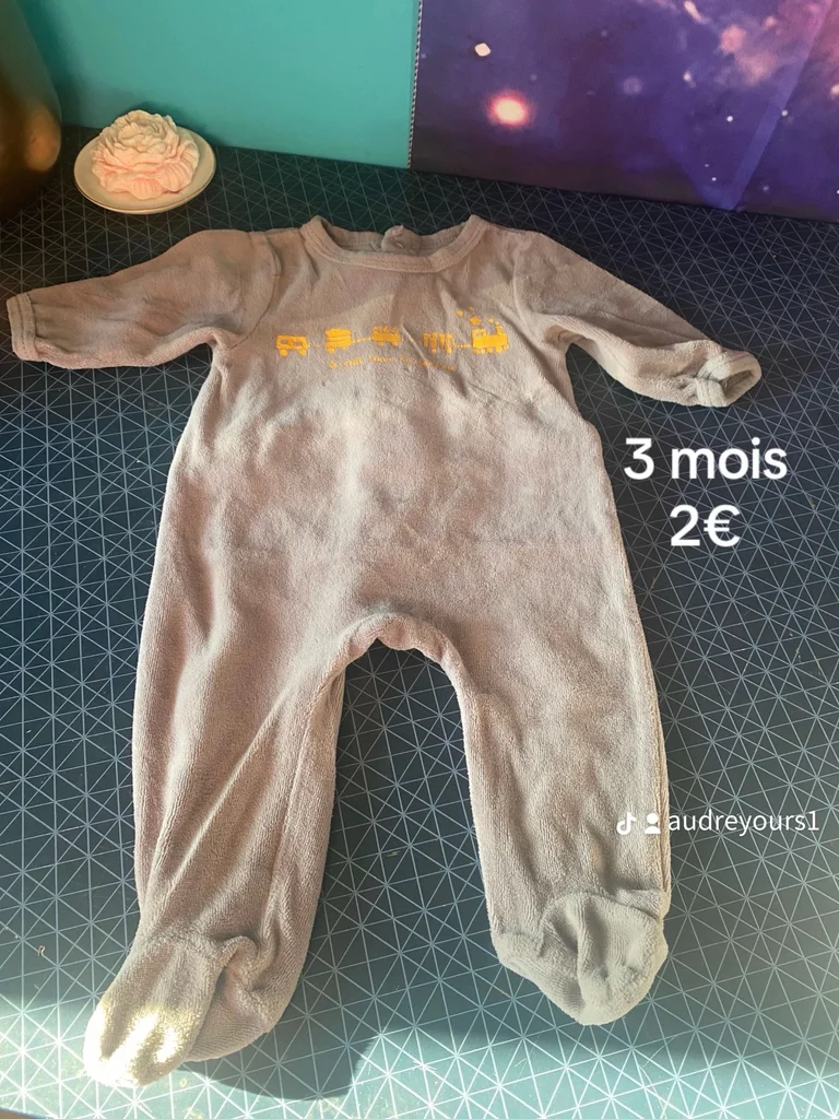 Pyjama bébé en velours – 3 mois – Élégance & douceur absolue ✨ Craquez pour ce délicat pyjama en velours, pensé pour offrir à bébé un cocon de douceur et de confort dès les premiers mois 👶💛 Son coloris gris intemporel, sublimé par un motif raffiné à l’avant, en fait une pièce à la fois chic et apaisante. La matière velours, particulièrement douce, enveloppe bébé de chaleur tout en respectant sa peau fragile. ✔️ Taille : 3 mois ✔️ Velours de qualité, toucher soyeux ✔️ Pieds intégrés pour un confort optimal ✔️ Coupe élégante et pratique ➡️ Très bon état général, prêt pour une nouvelle vie