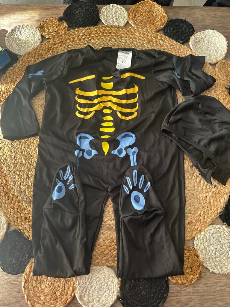 Costume bébé Halloween. Composé d’une combinaison noire motif squelette et d’une cagoule. Très bon état, servi une fois.