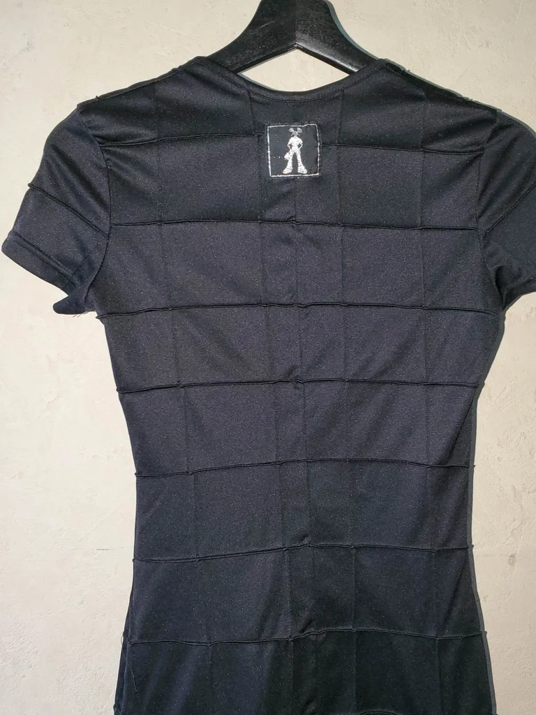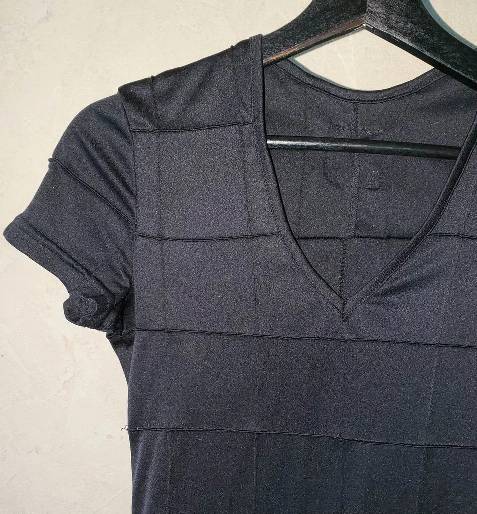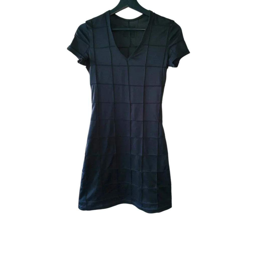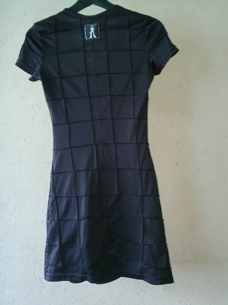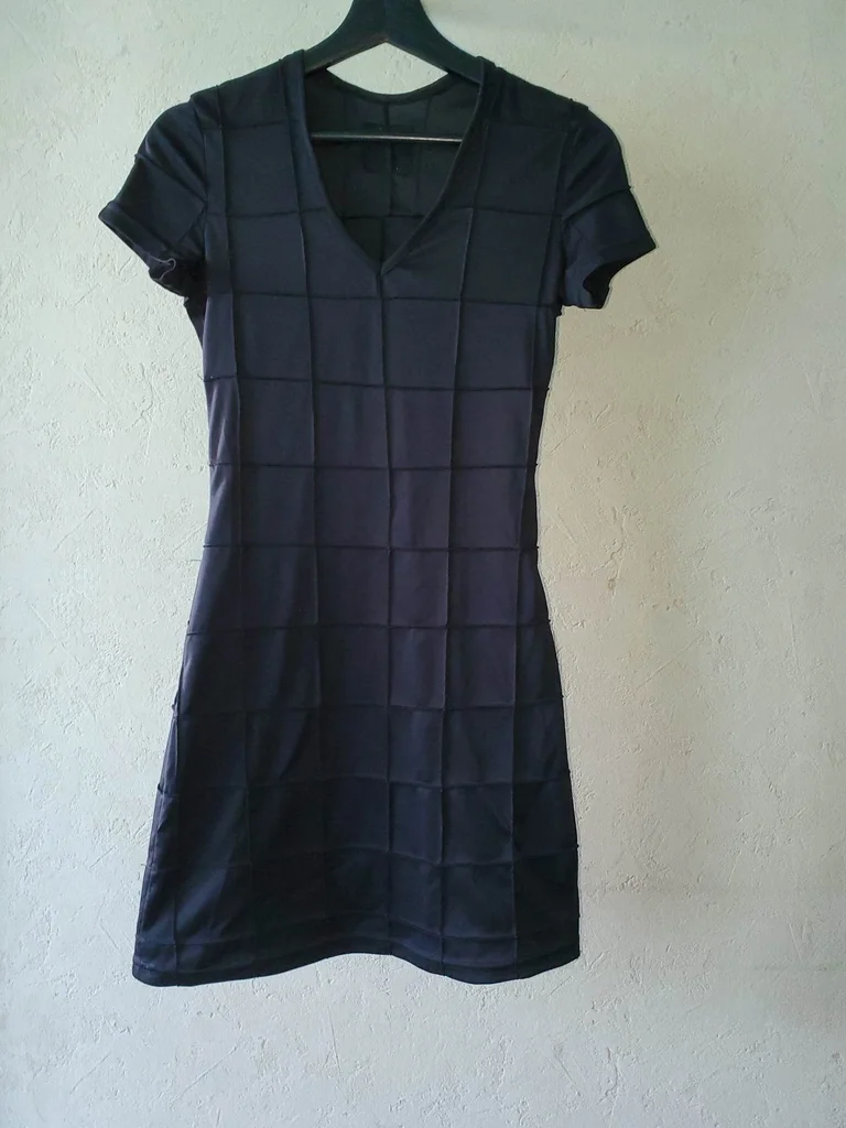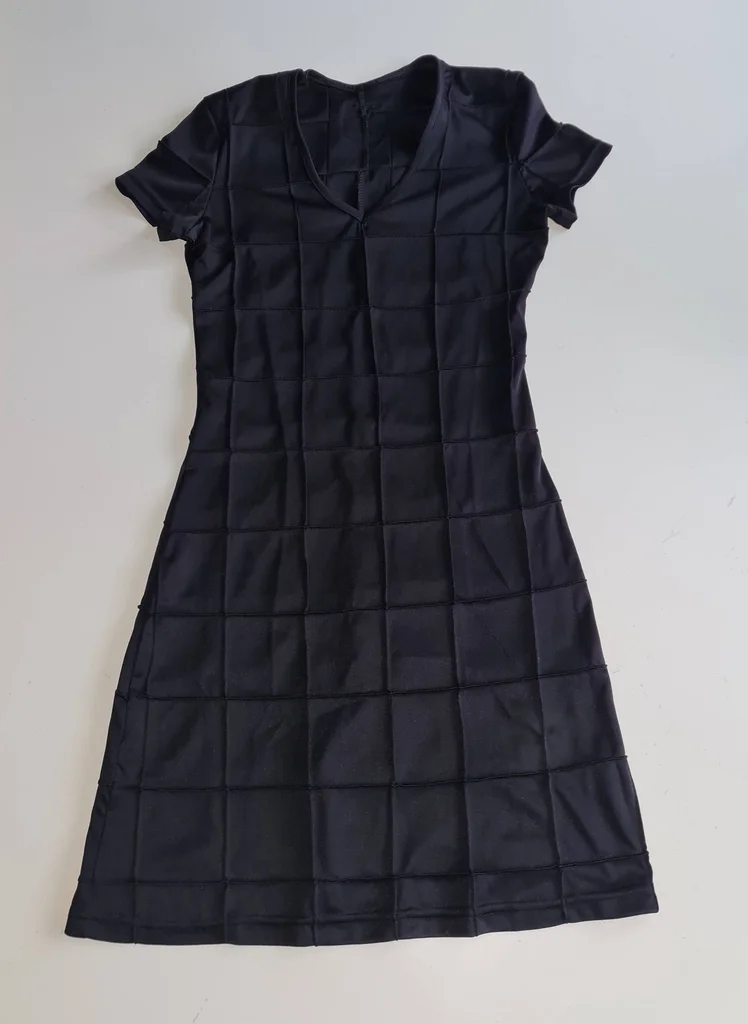 marque inconnue robe noire tissu couture quadrillée extensible, semi légère ( étiquette coupée) satinée col V cintrée petites manches 15cm épaules 37cm taille 68/75cm longueur 85cm #lesplacardsenfolietaille34 ref2
