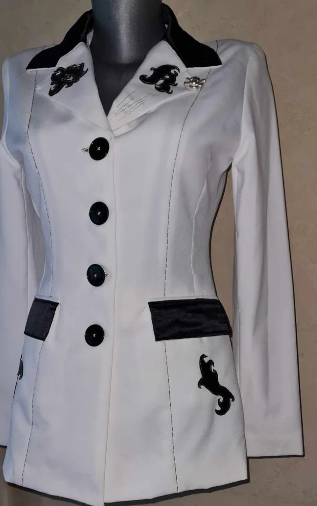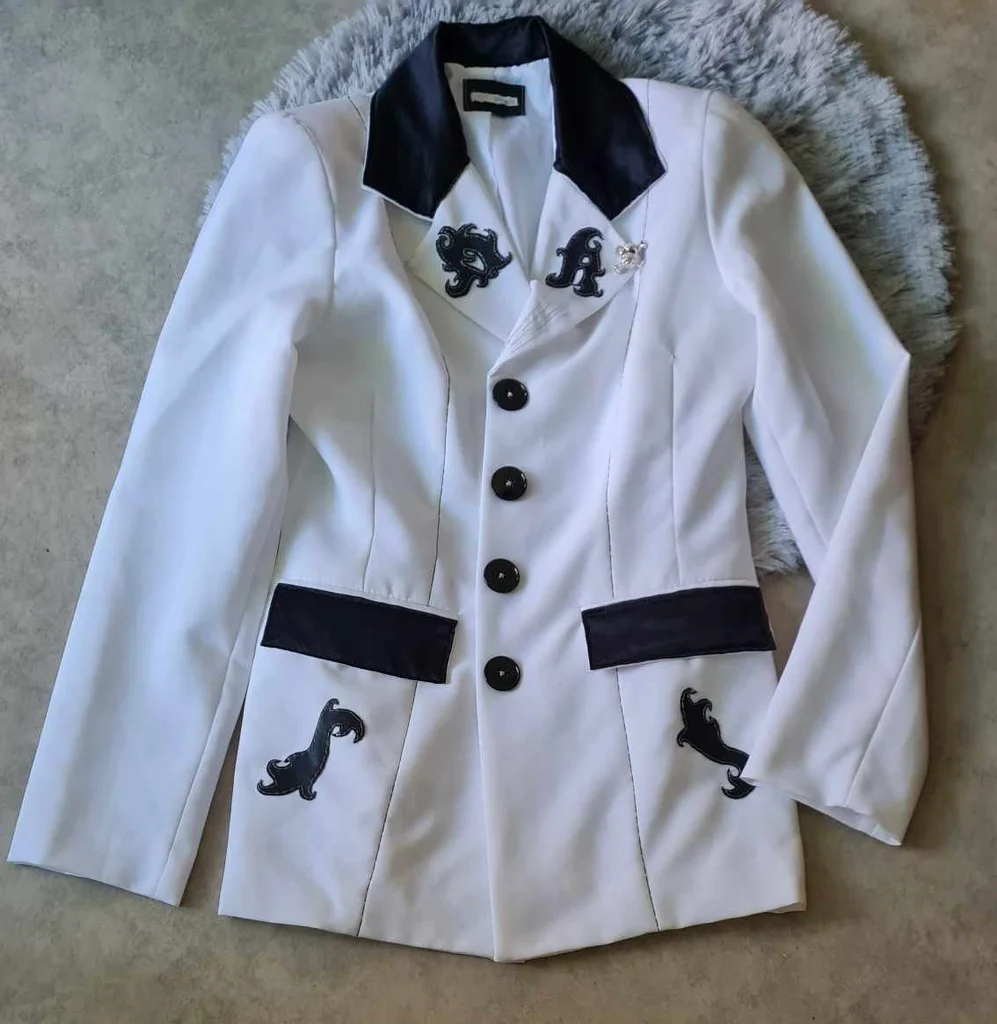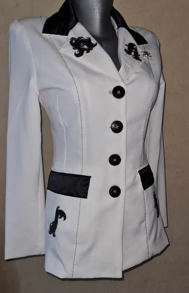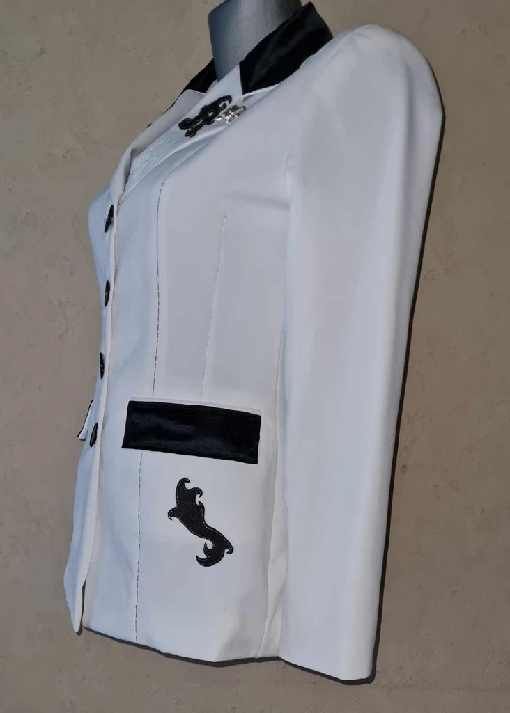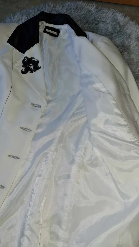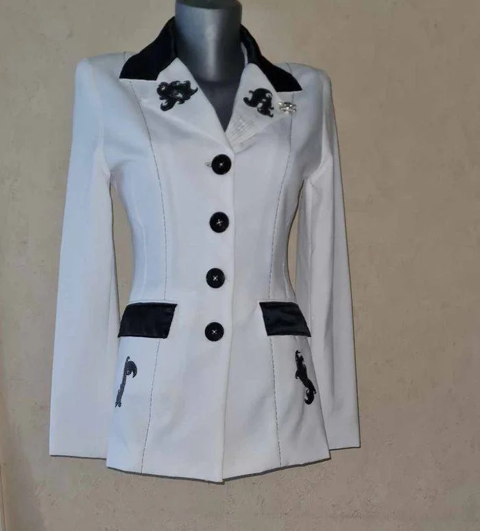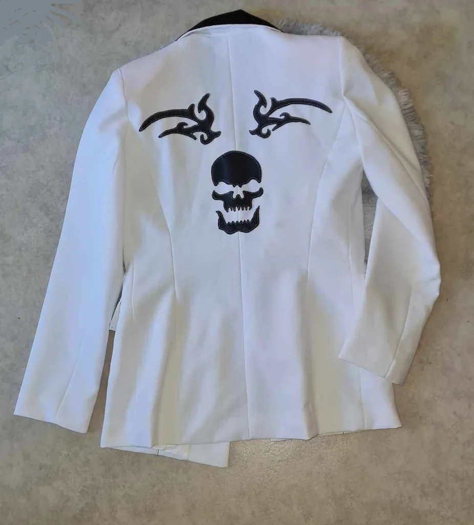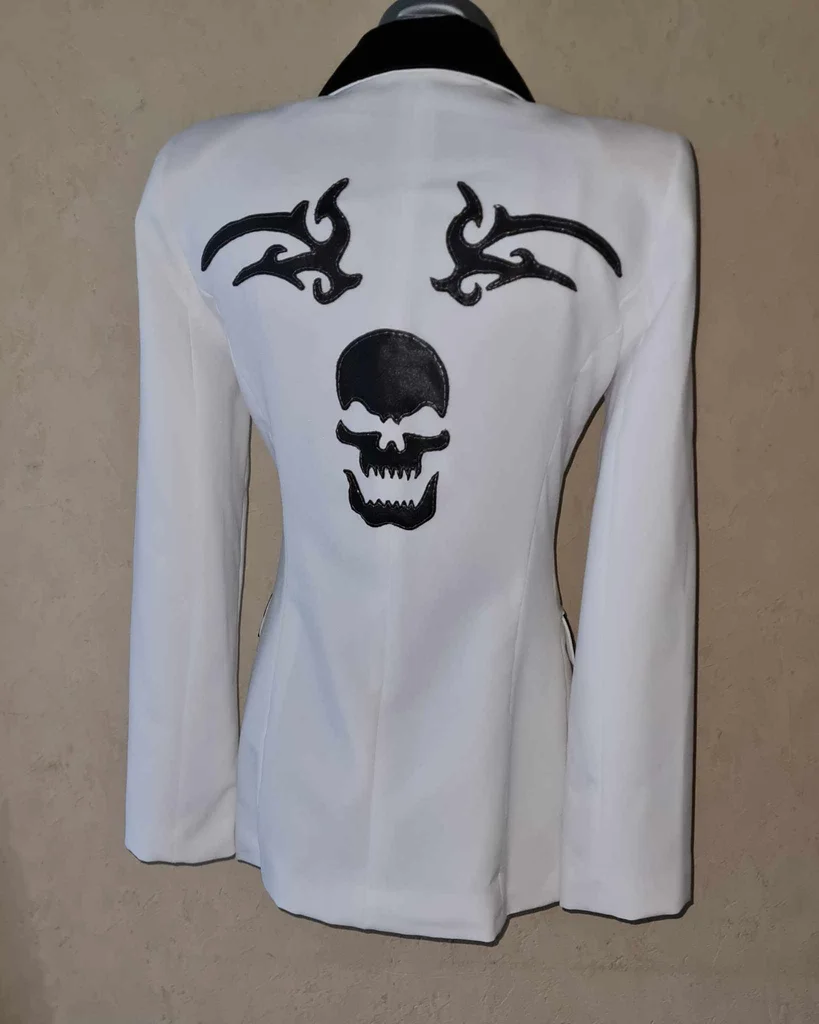 ancienne veste Jennyfer customisée modèle unique blanche cintrée tissu simili cuir noir et satiné poches / col tissu noir satiné broche tête de mort argentée sur le col fil noir / argenté épaulettes longueur 60cm aisselles 49cm épaules 38cm taille 78cm manches 61cm #lesplacardsenfolietaille36 #lesplacardsenfolietaille38