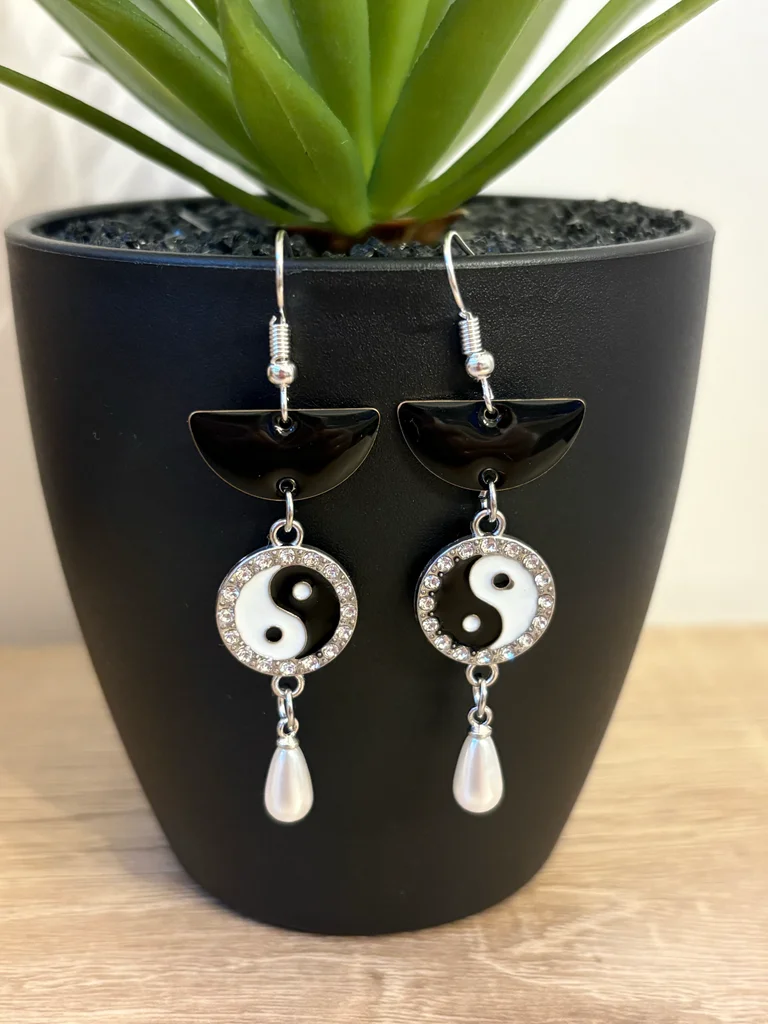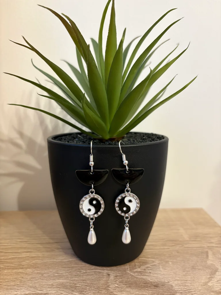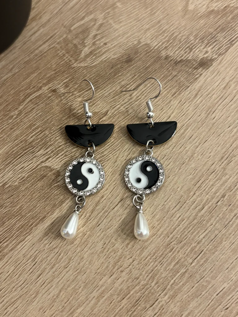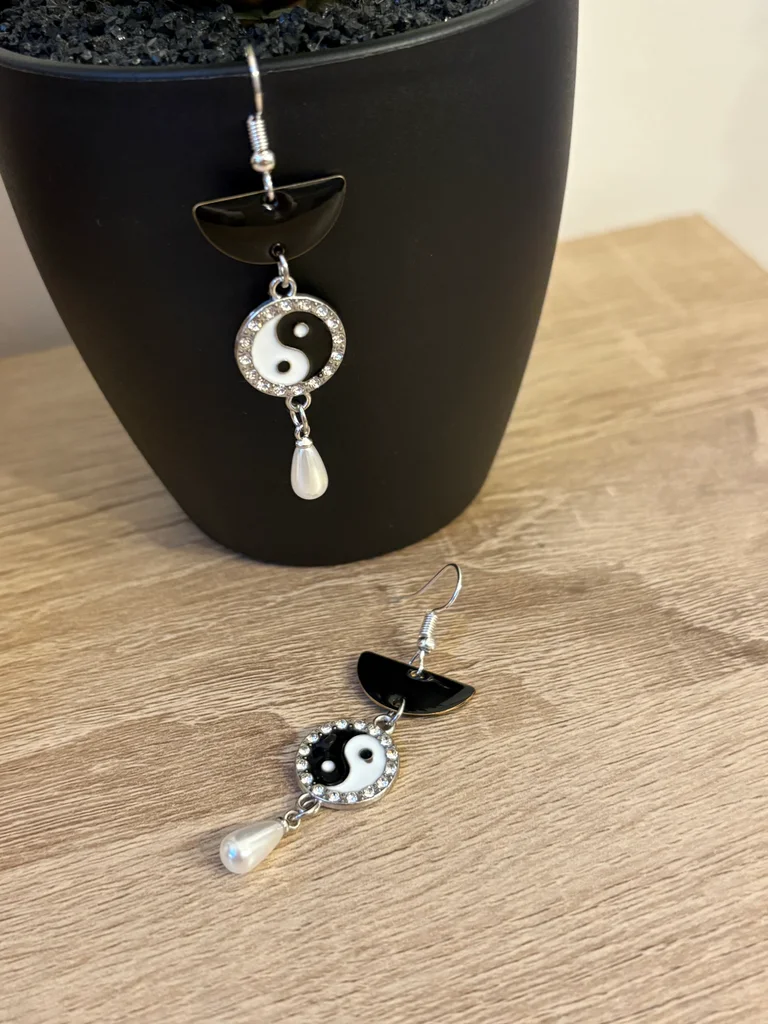 Boucles d'oreilles pendantes Yin Yang – Émail noir, Cristaux et Perles Neuve Expédition rapide et emballage soigné.