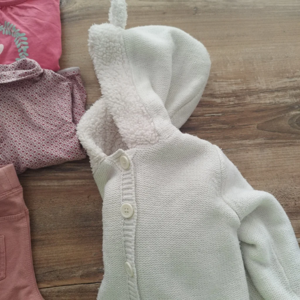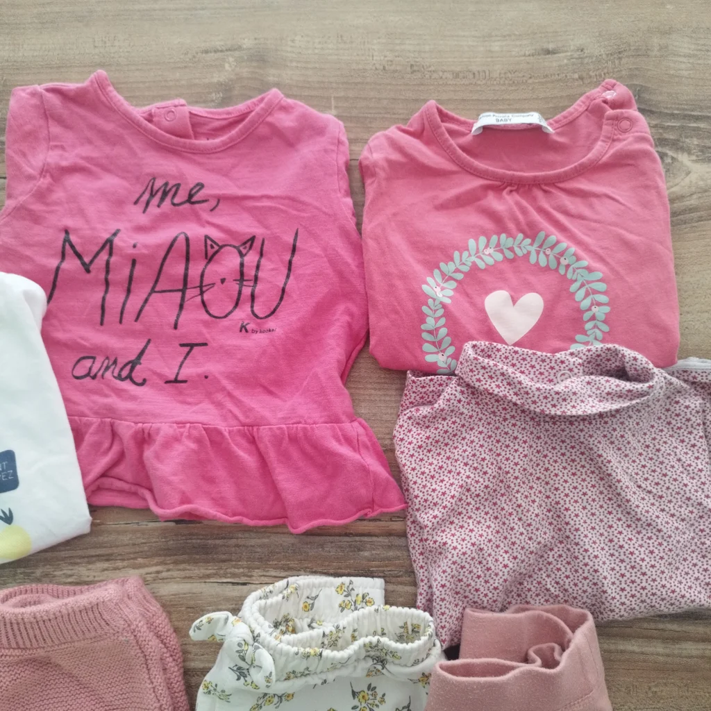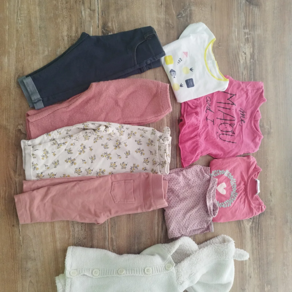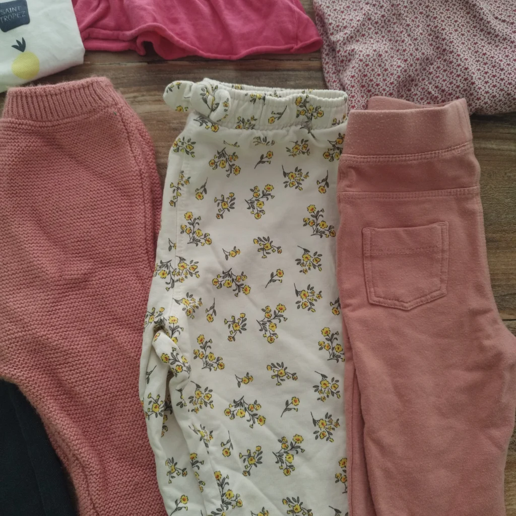 Lot fille comprenant 4 bas en 12 mois Un gilet 80 cm Un t-shirt manche courte 12 mois Un manche longue 12 mois Deux manche longue 18 mois Plusieurs marques tbe général