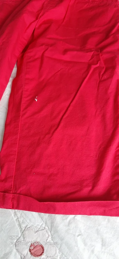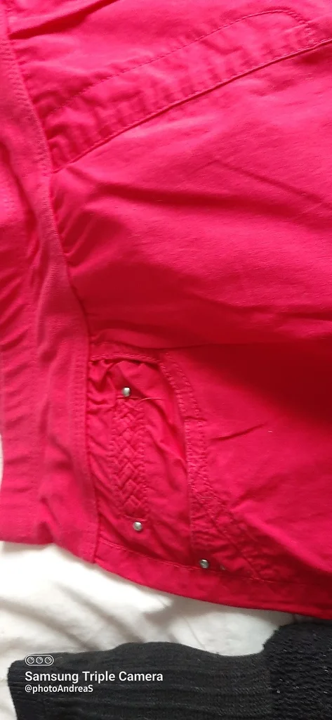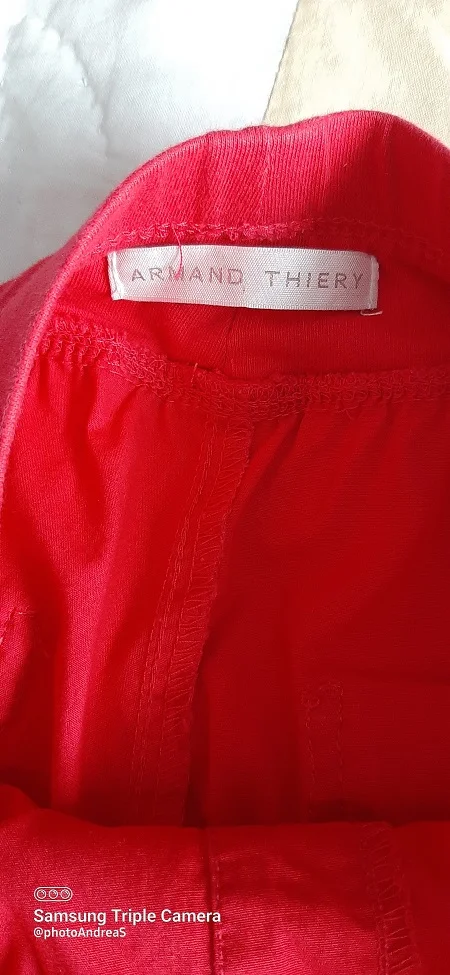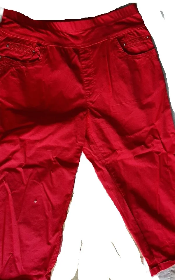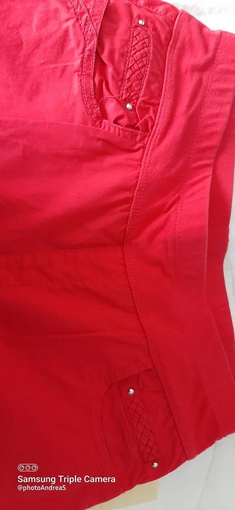 pantacourt rouge taille 38, il est rouge pas comme sur la photo ( impossibloe de faire ressortir la couleur), taille elastique, poche, entrejambes 47cm, taille 35 cm à plat non étiré, jamais porté