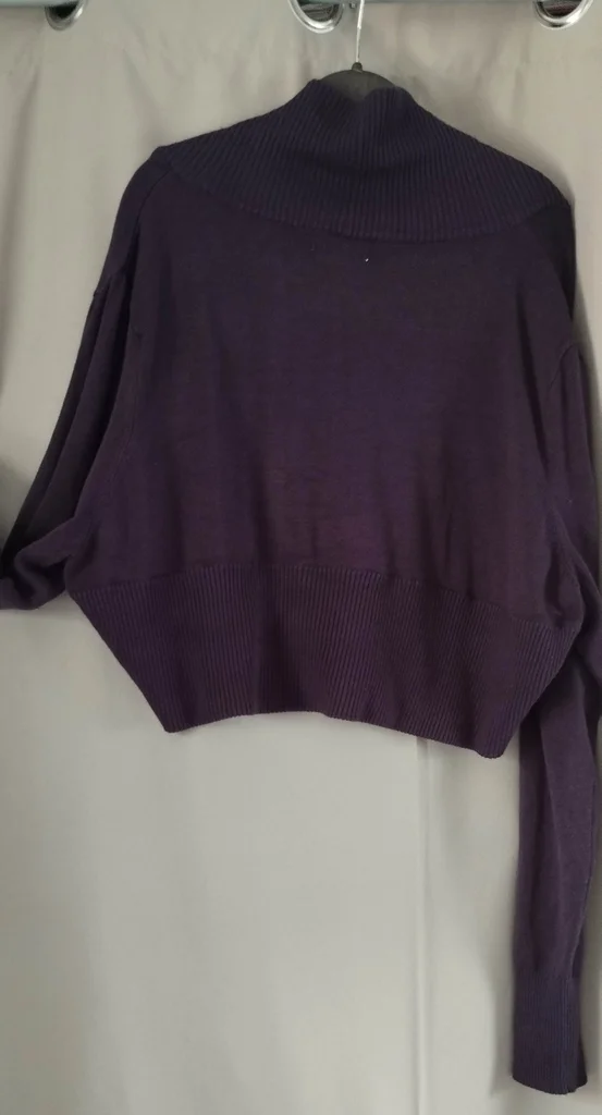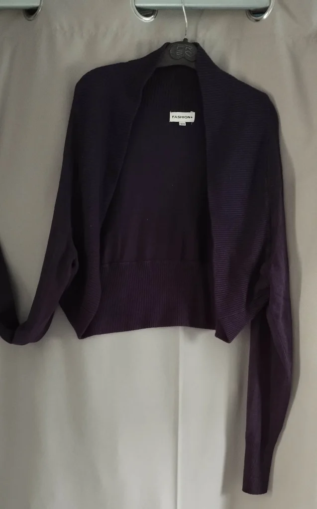 boléro, gilet court prune, violet foncé, grande taille , il y a écrit 50-52 mais je fais du 44-46 et ca me va aussi, en tres bon état, utile toute l année pour chaque occasion, belle qualité , maille pas trop fine