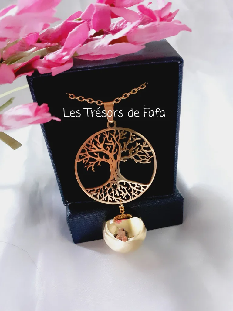 🤰 Bola de grossesse fait-main composé : - d'une chaîne en acier inoxydable doré d'une longueur d'environ 105 cm. - d'une boule sonore plaquée or de diamètre 20 mm. - d'un connecteur arbre de vie en acier inoxydable doré.