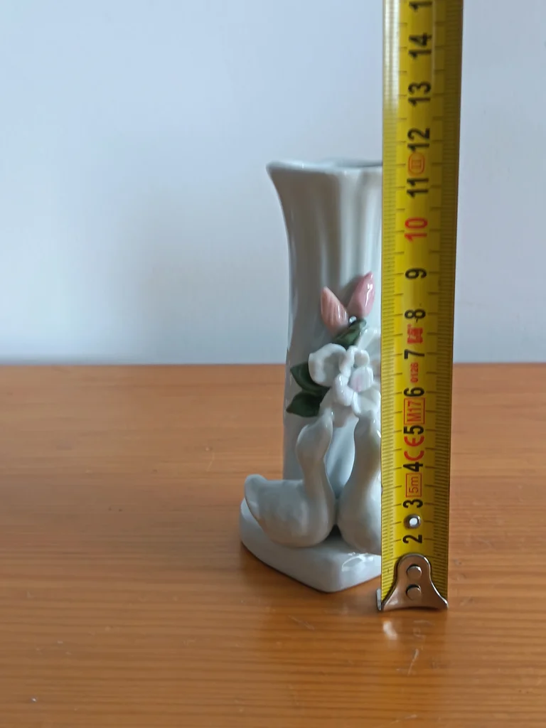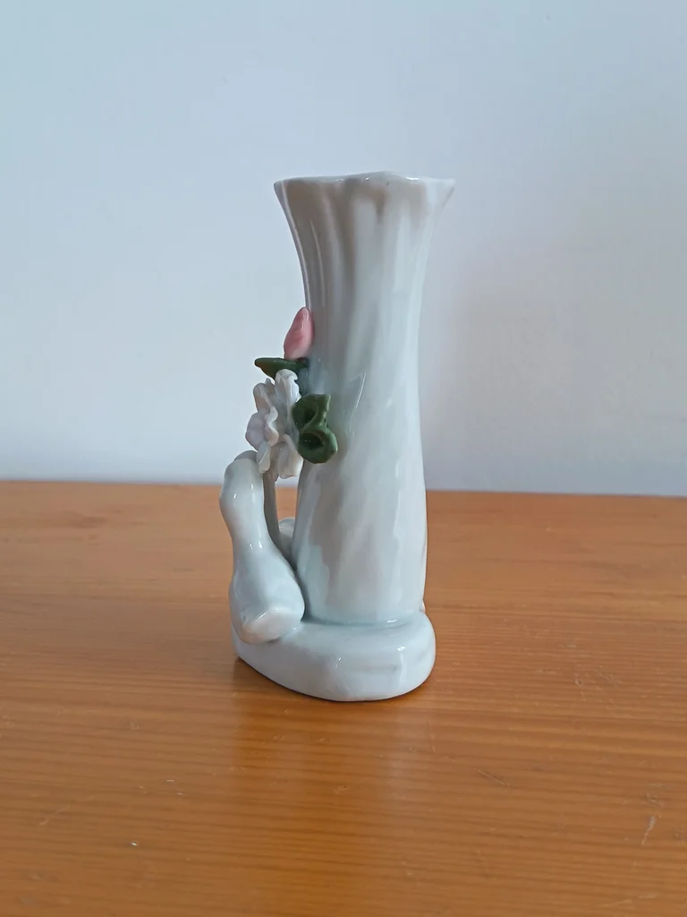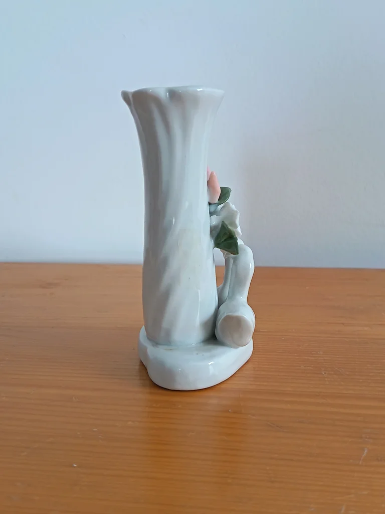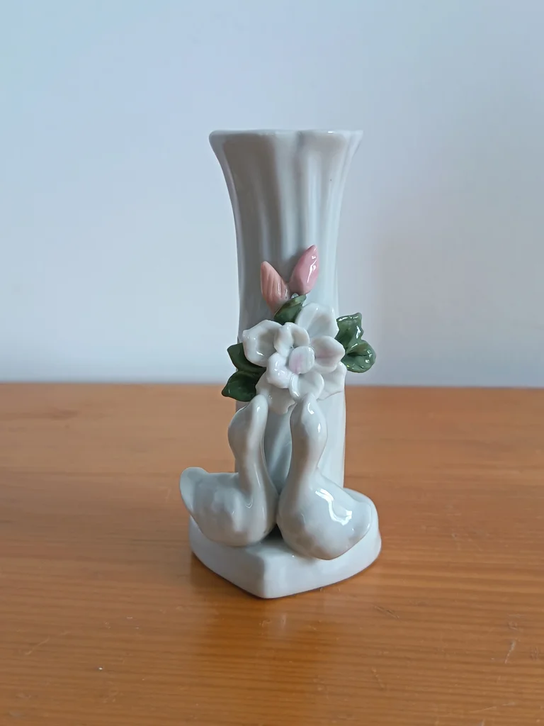 Très joli petit vase, blanc (ou gris très clair), Joliment décoré avec 2 petits canards et une fleur rose pâle et fleurs vertes claires, Base en forme de cœur Très certainement en porcelaine (pas d'indication j'ai également un petit vase fleurs qui est en porcelaine) ou en faïence, Dimensions : hauteur environ 11,30cm Très bon état, aucun défaut apparent J’ai un autre vase dans le même style