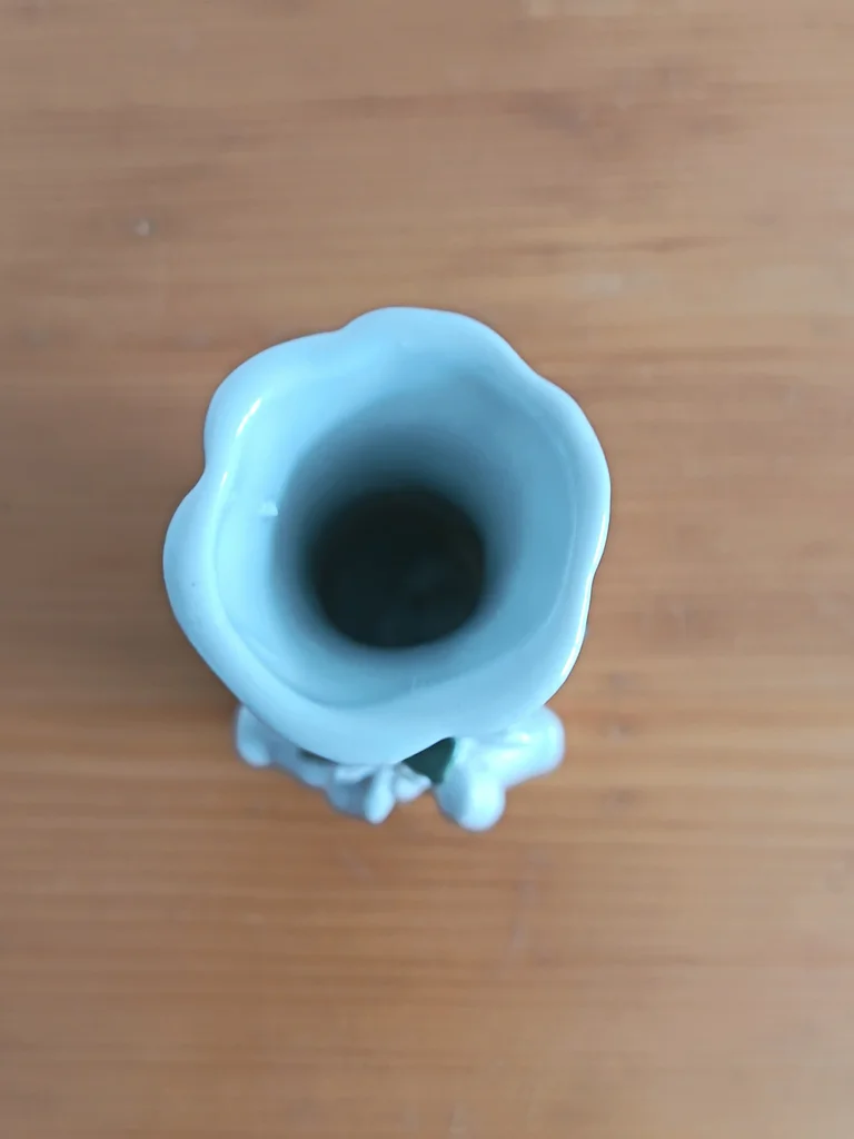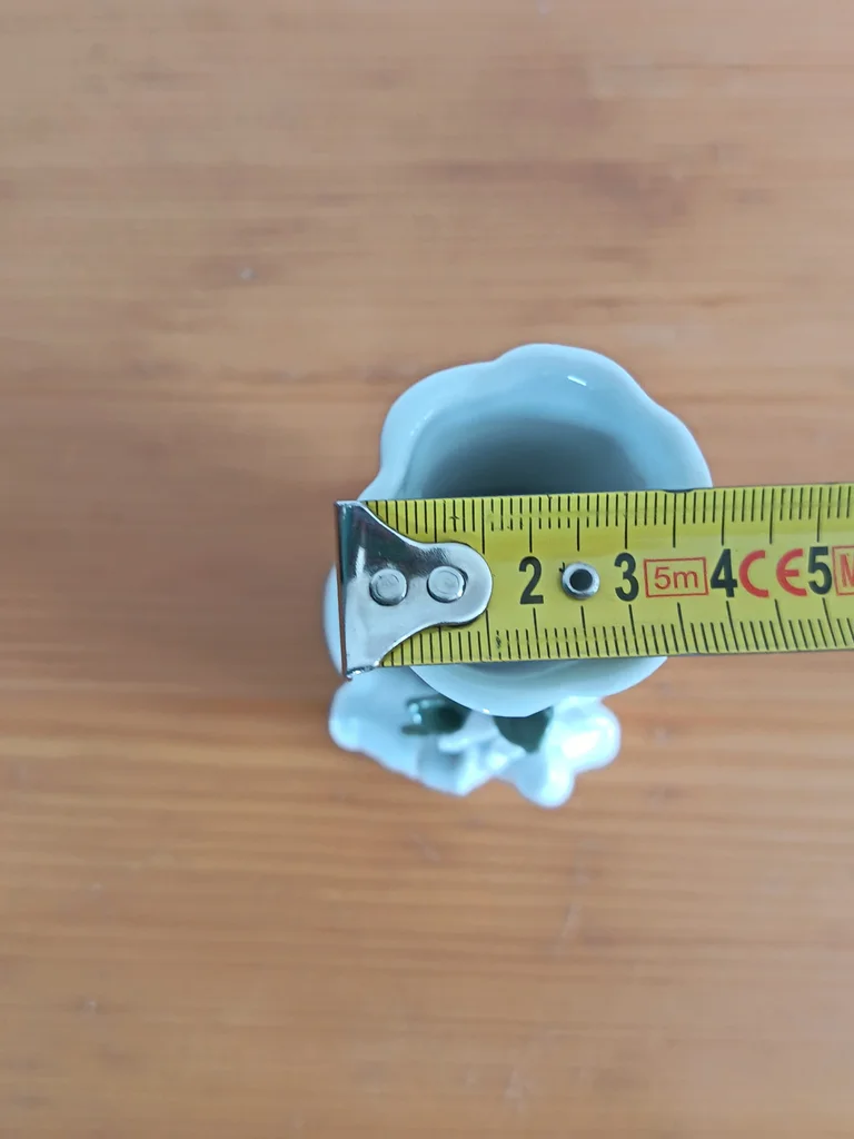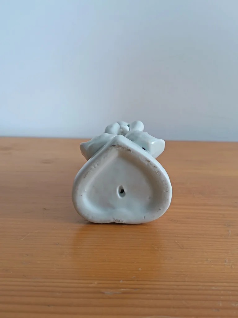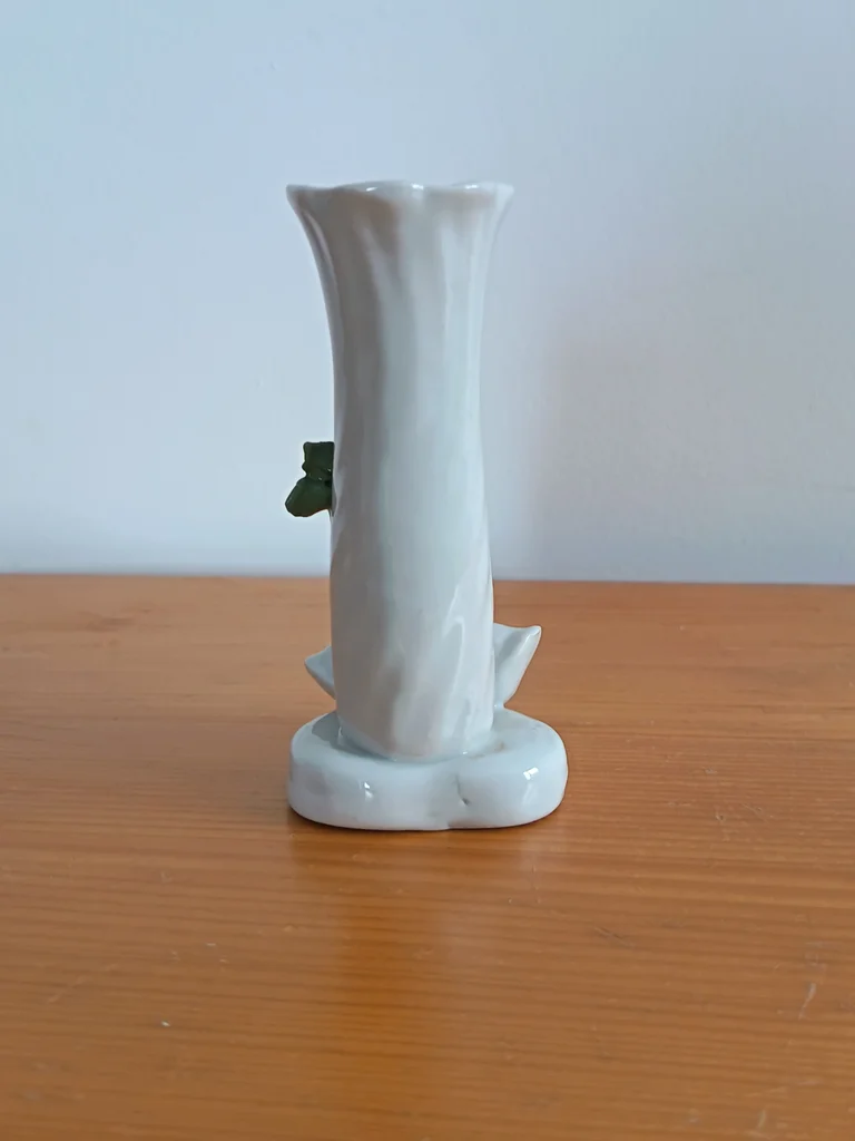 Très joli petit vase, blanc (ou gris très clair), Joliment décoré avec 2 petits canards et une fleur rose pâle et fleurs vertes claires, Base en forme de cœur Très certainement en porcelaine (pas d'indication j'ai également un petit vase fleurs qui est en porcelaine) ou en faïence, Dimensions : hauteur environ 11,30cm Très bon état, aucun défaut apparent J’ai un autre vase dans le même style