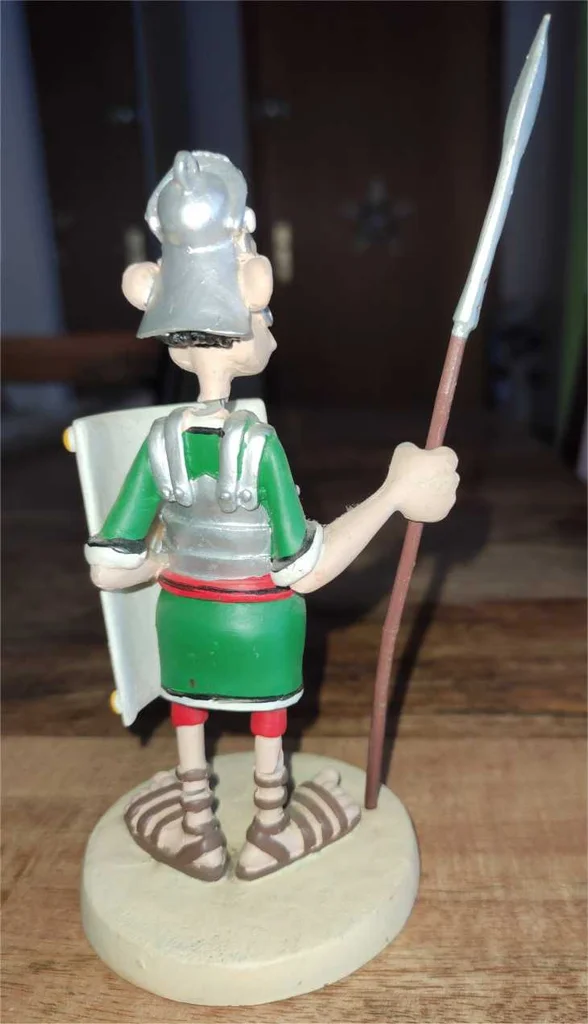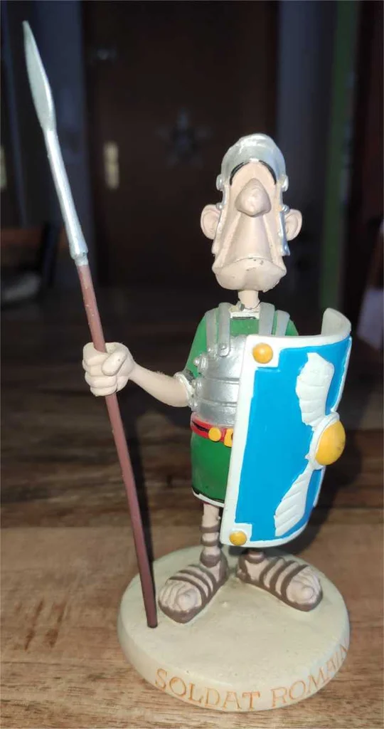 🗡️ Figurine Un soldat romain au garde à vous ⚔️ … enfin, au garde-à-peu-près. ! En effet, notre brave légionnaire a manifestement croisé la route d’Obélix 💪 un jour de mauvaise humeur. Résultat (voir photos) : - Cou cassé - Chevilles cassées - Dignité romaine légèrement entamée Bonne nouvelle : grâce à son armature métallique interne, il tient encore debout et peut continuer à faire semblant d’être en service. Mauvaise nouvelle : il a clairement perdu son combat contre Obélix. Idéal pour collectionneurs avec le sens de l’humour ou fans d’Astérix qui aiment les figurines avec une histoire Collection Astérix Atlas Plastoy 2001 Matière résine Numéro 15 dans la Collection Tiré de l'album Astérix chez les Helvètes , planche 19, case 9 Hauteur 14,5 cm Largeur 7 cm Poids 140g environ Vendu tel que présenté sur photos .