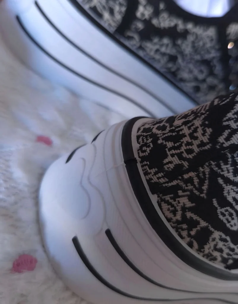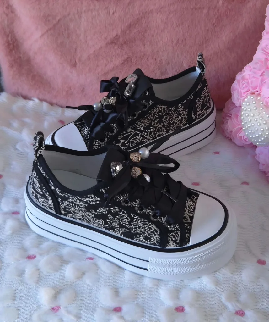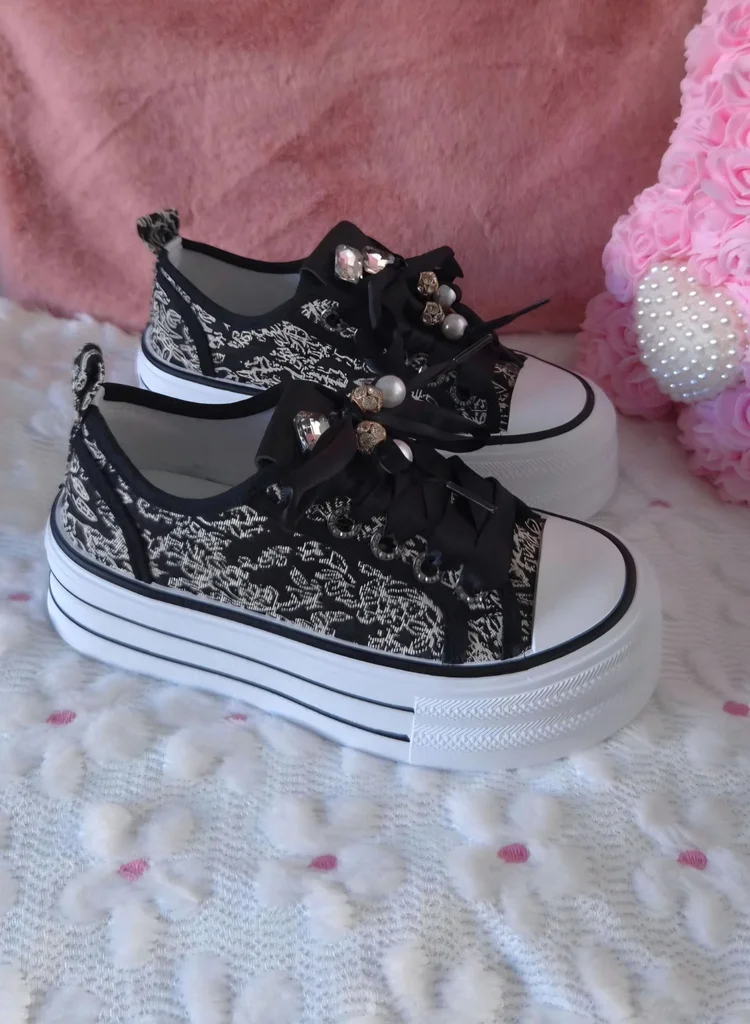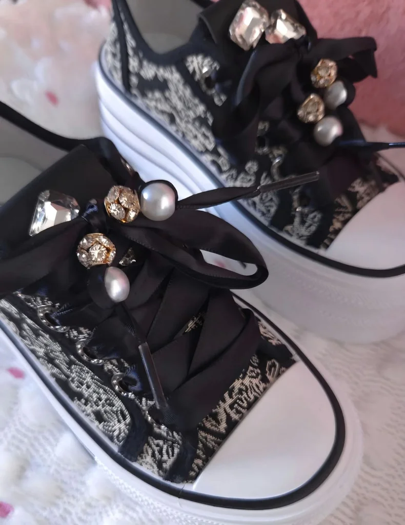 Baskets noires Lacet ruban + lacet basique dans la boite. Les bijoux peuvent être retirés et mit sur l'autre lacet. Elles sont neuves et taillent très bien 39. La hauteur de la semelle est de 5cm