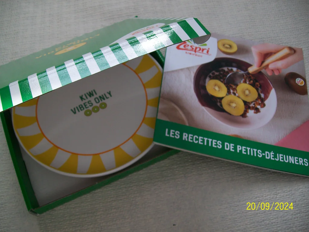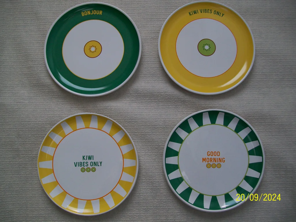 Lot de 4 assiettes plates ( à dessert ) aux couleurs de " Zespri " . Diamètre : 20 cm - Poids : 413g - Passe au micro-ondes et lave-vaisselle. Chaque assiette est dans un coffret , dimensions : 21,5 x 20,5 x 2,5 cm, et est accompagnée d'un petit livret comportant des recettes de petits-déjeuners avec des kiwis Zespri. *** Article NEUF. Possibilité d'envoi.