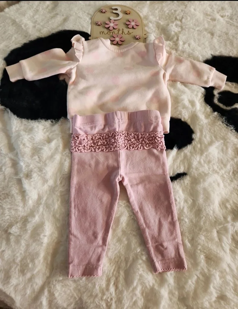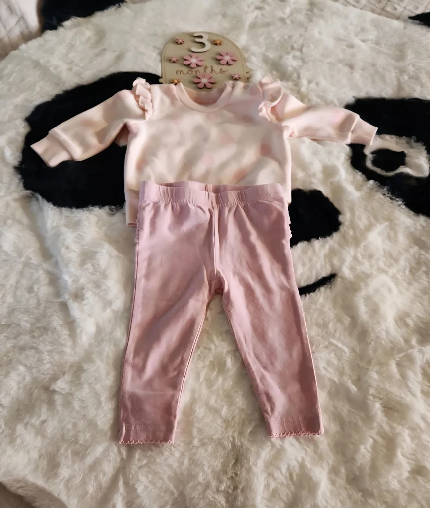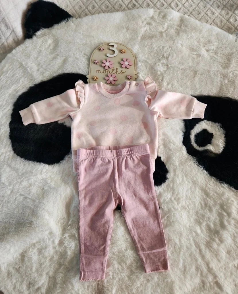 ravissant ensemble pour bébé fille en taille 3 mois. Il se compose de : Un sweat léger rose pâle à pois, avec de jolis volants aux épaules et des boutons-pression au col pour un habillage facile. Un legging assorti vieux rose, confortable et élastiqué à la taille. État : Très bon état Matière : Tout doux, parfait pour la saison ! 📦 Envoi rapide et soigné. N'hésitez pas à faire un lot pour réduire les frais de port Maison non-fumeur