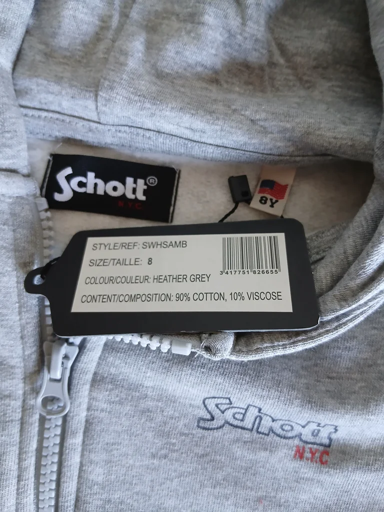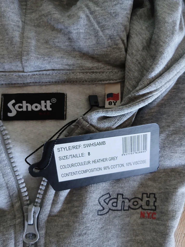 Sweat Zippé à capuche Schott Taille 8 ans Neuf avec étiquette 80% coton et 20% polyester
