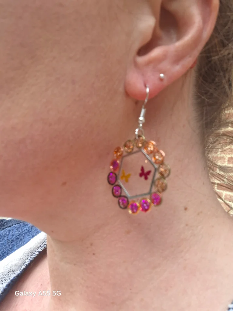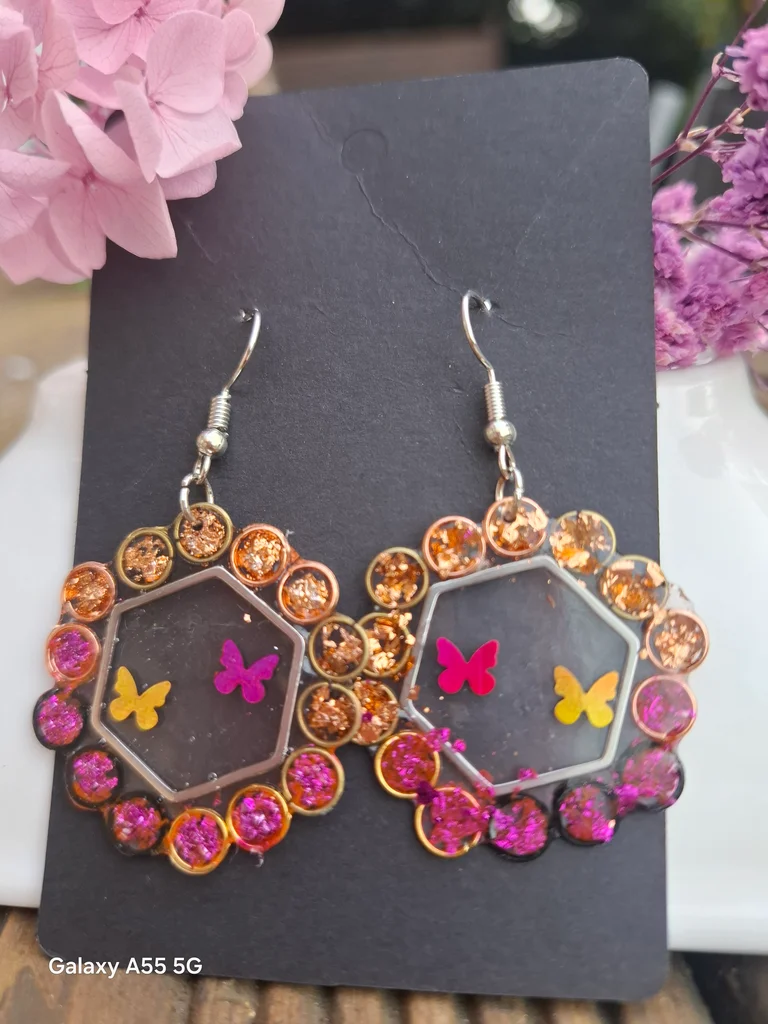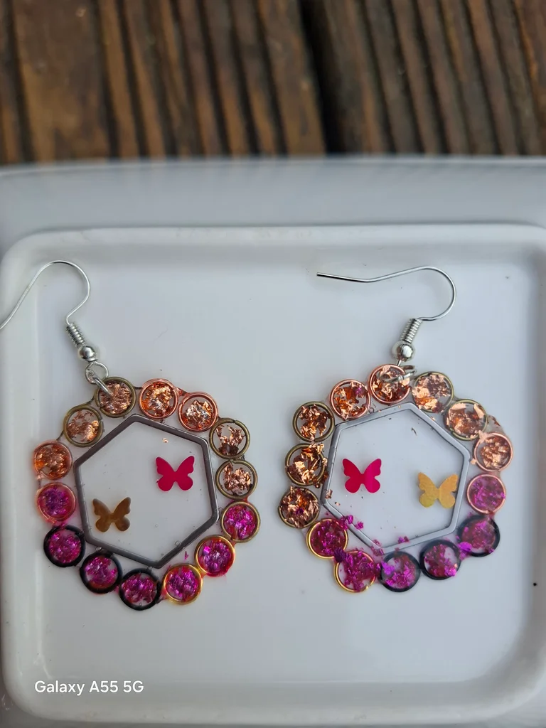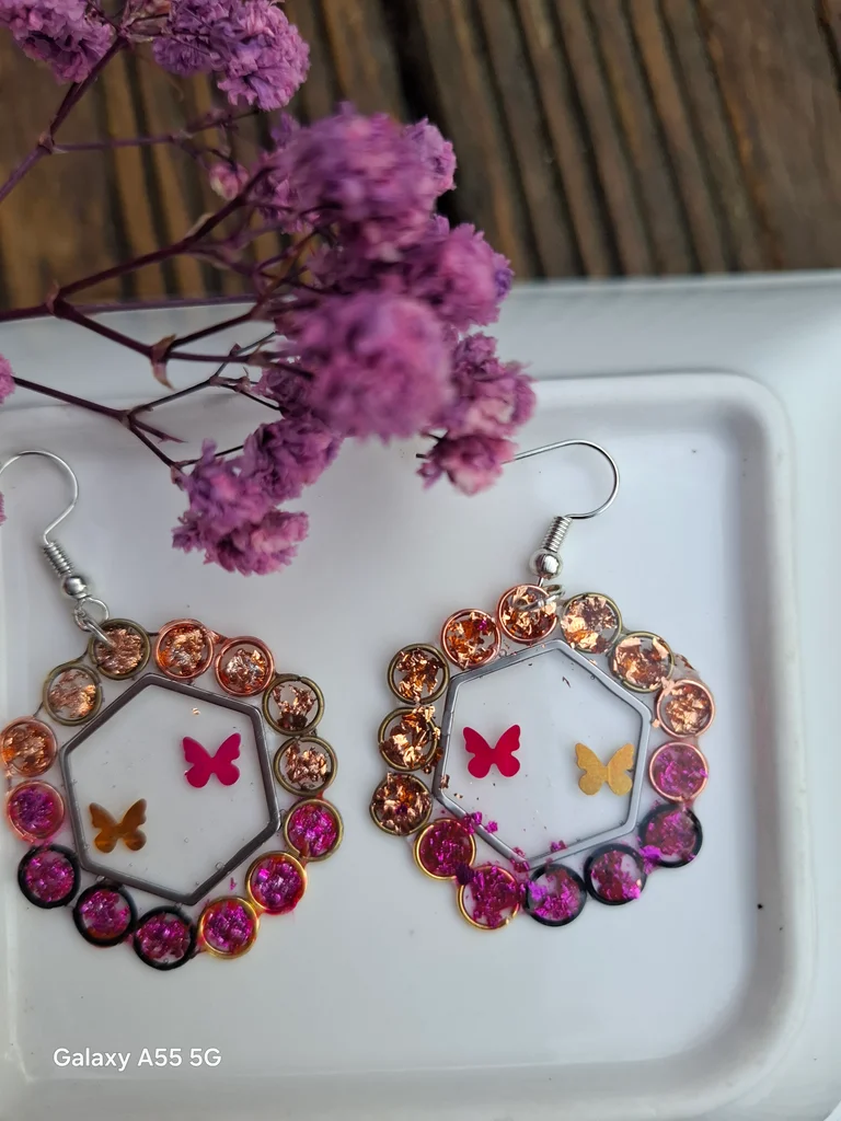 Laisse parler ta créativité avec ces boucles d’oreilles uniques au design artistique et délicat 🦋✨ Au centre, de jolis papillons colorés semblent flotter dans une structure géométrique moderne, entourée de petits cercles remplis de paillettes aux nuances dorées, roses et violettes. Le mélange des textures et des couleurs crée un bijou lumineux et captivant. Chaque détail apporte du relief et du mouvement, pour un rendu à la fois élégant, original et plein de personnalité. Entièrement faites à la main, ces boucles sont de véritables pièces uniques 💖