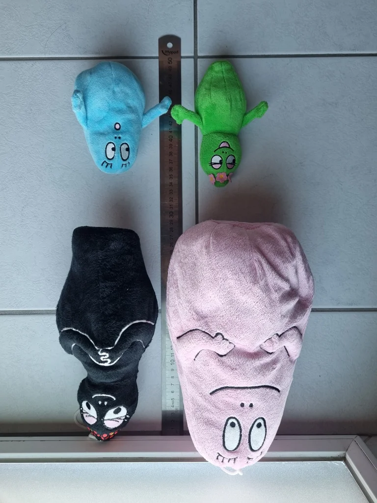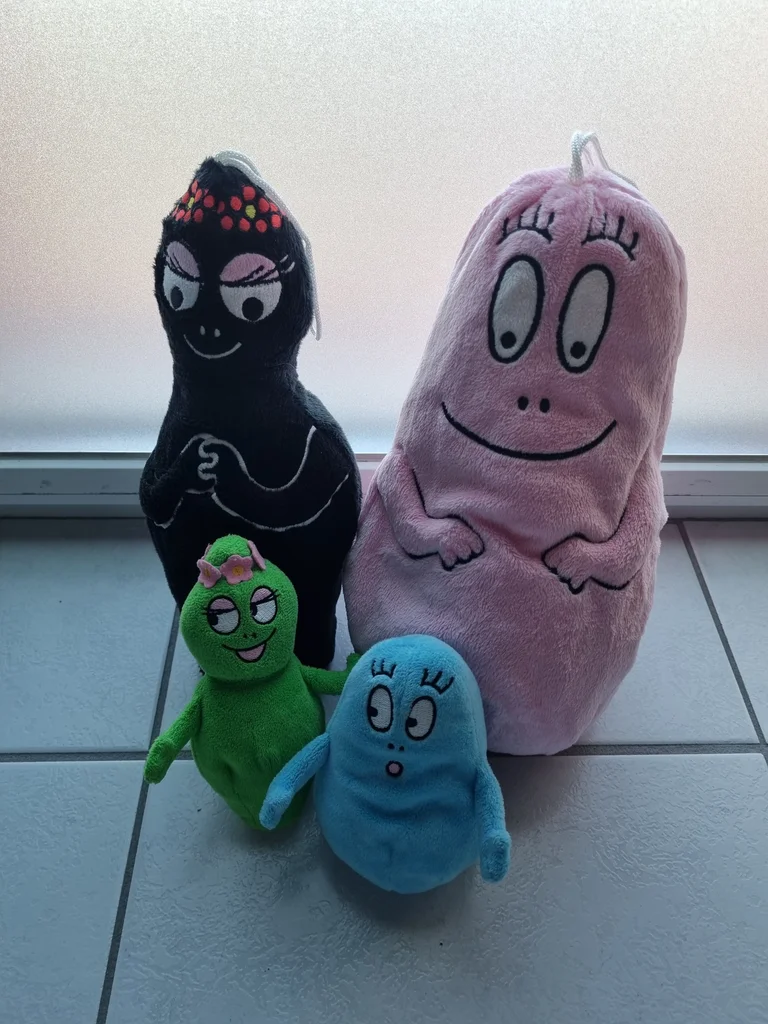 Bonjour, Je vends ce joli lot de 4 peluches authentiques Barbapapa. Le lot comprend : - La grande peluche rose (Barbapapa) - La peluche noire (Barbamama) avec son nœud floral - La petite peluche verte (Barbalala) avec ses fleurs roses - La petite peluche bleue (Barbouille) Elles sont en bon état général, très douces et propres. Idéal pour un enfant ou pour compléter une collection ! ⚠️ Reste une seule etiquette sur les 4 peluches car les autres ont ete decoupees Dimensions : Voir photos Maison non fumeur 🚭 Si vous avez des questions n'hésitez pas 🤗