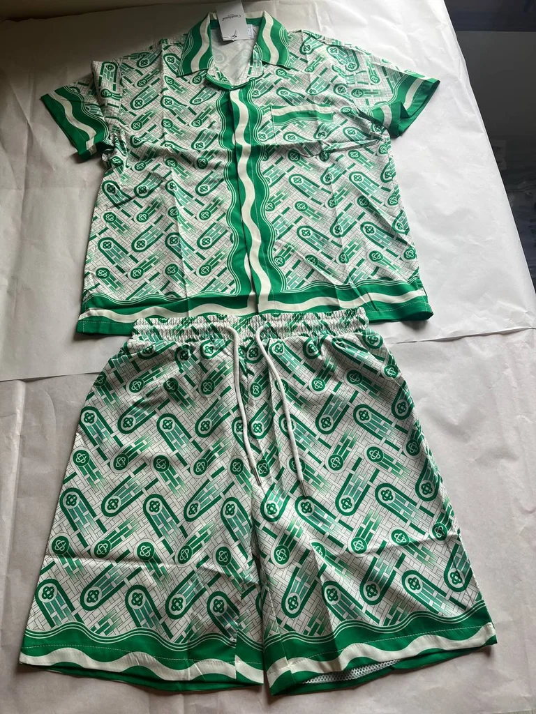 Ensemble Casablanca Paris – Chemise + Short Taille : M Coloris : Blanc / Vert Chemise manches courtes col cubain Print monogramme CC all-over Motif vagues signature Casablanca Poche poitrine Short assorti cordon élastique blanc Label Casablanca® tissé col Matière satin soie premium 🔥 Vendu avec étiquettes – NEUF 🏷️