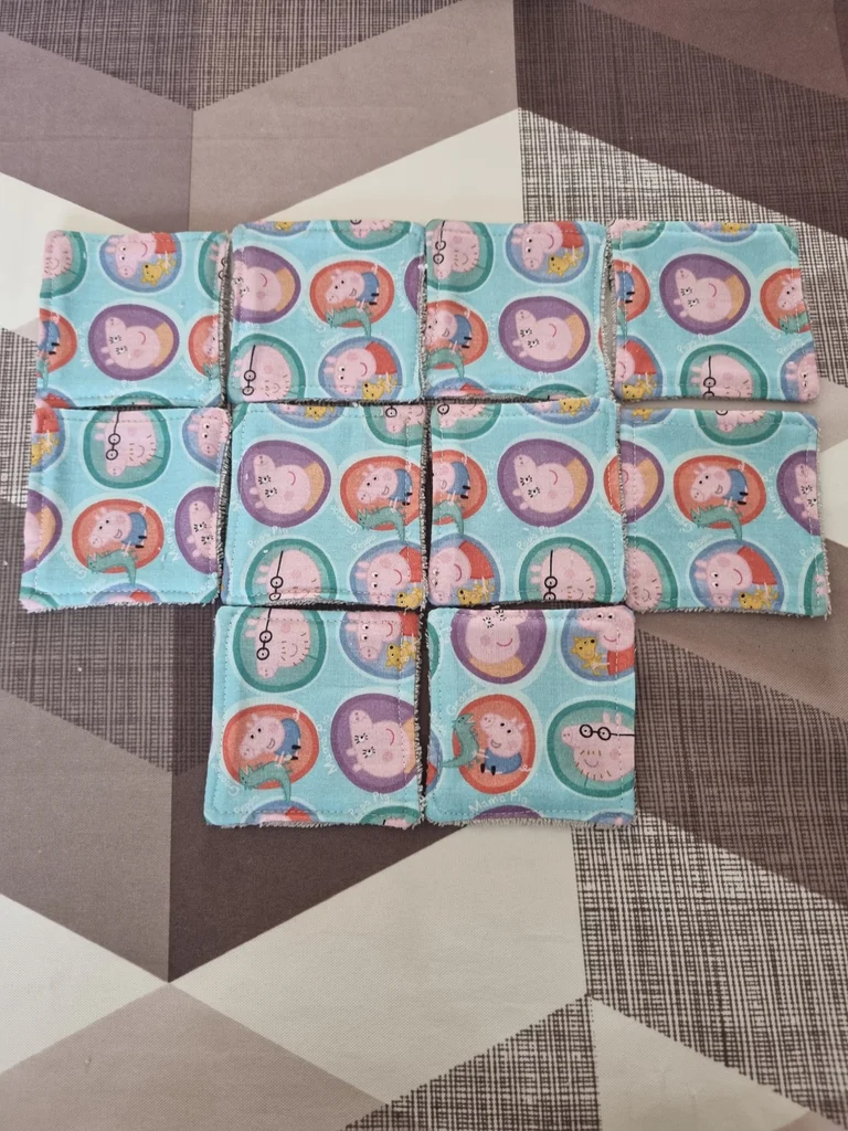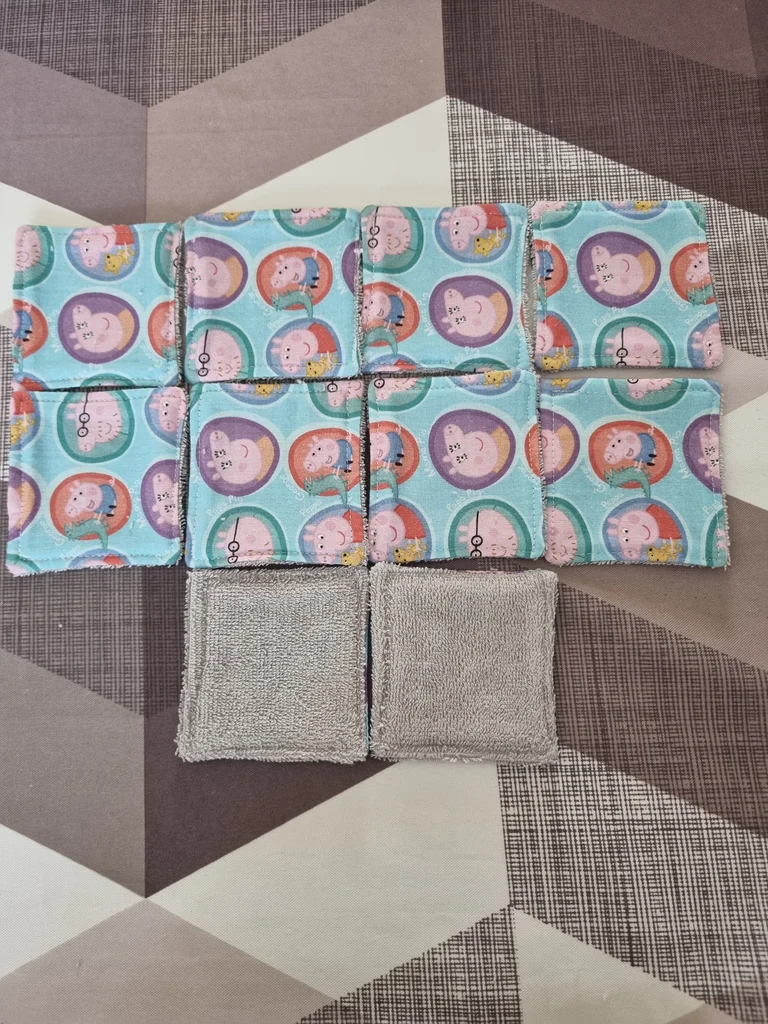 10 lingettes lavables Peppa pig Tissu coton et éponge bambou 8x8cm