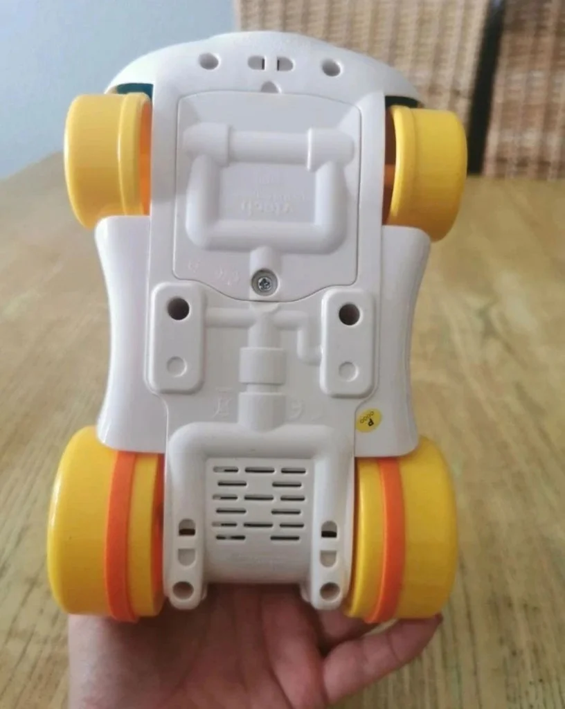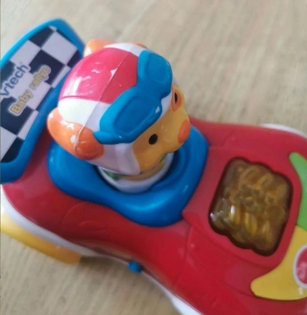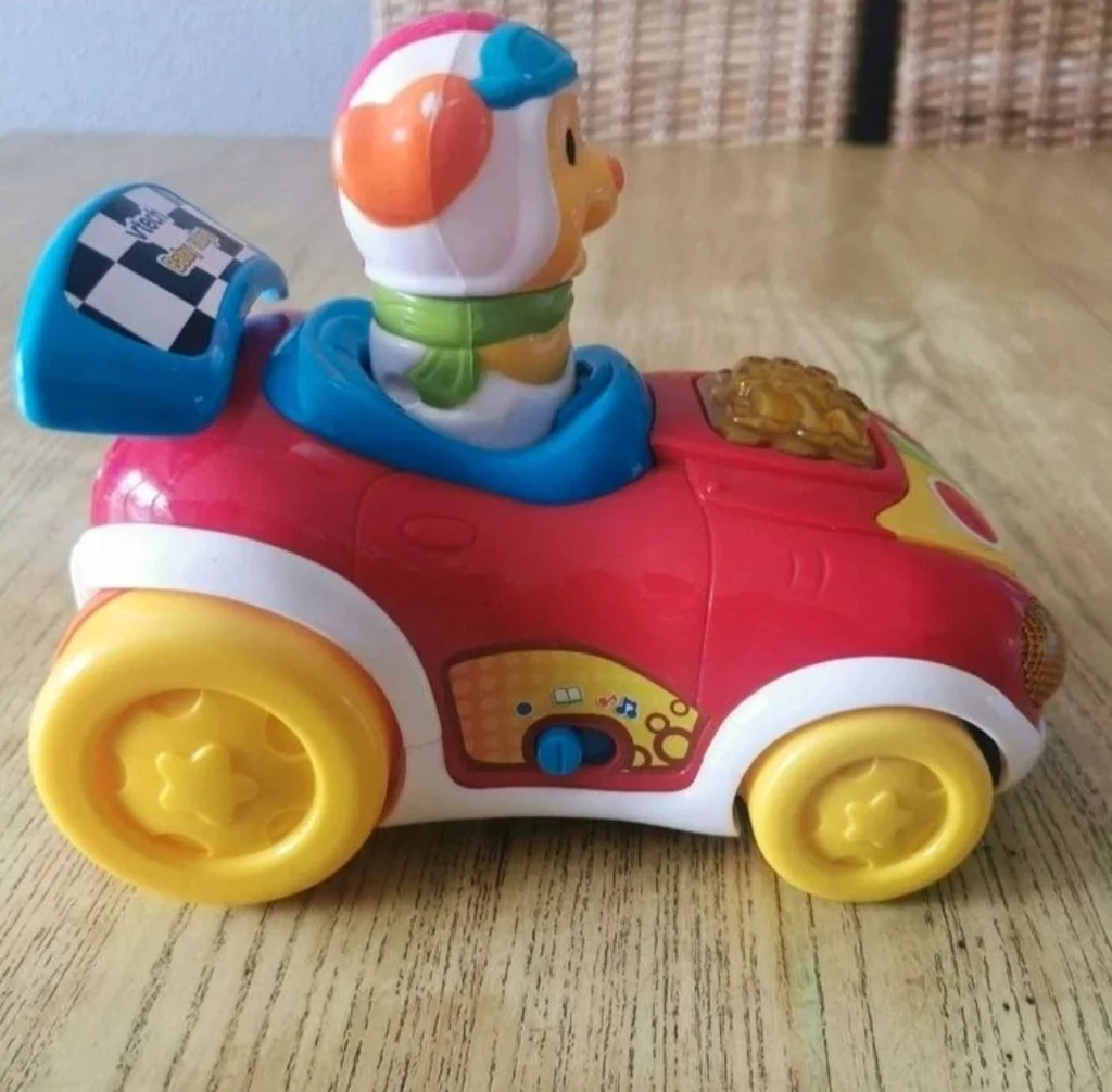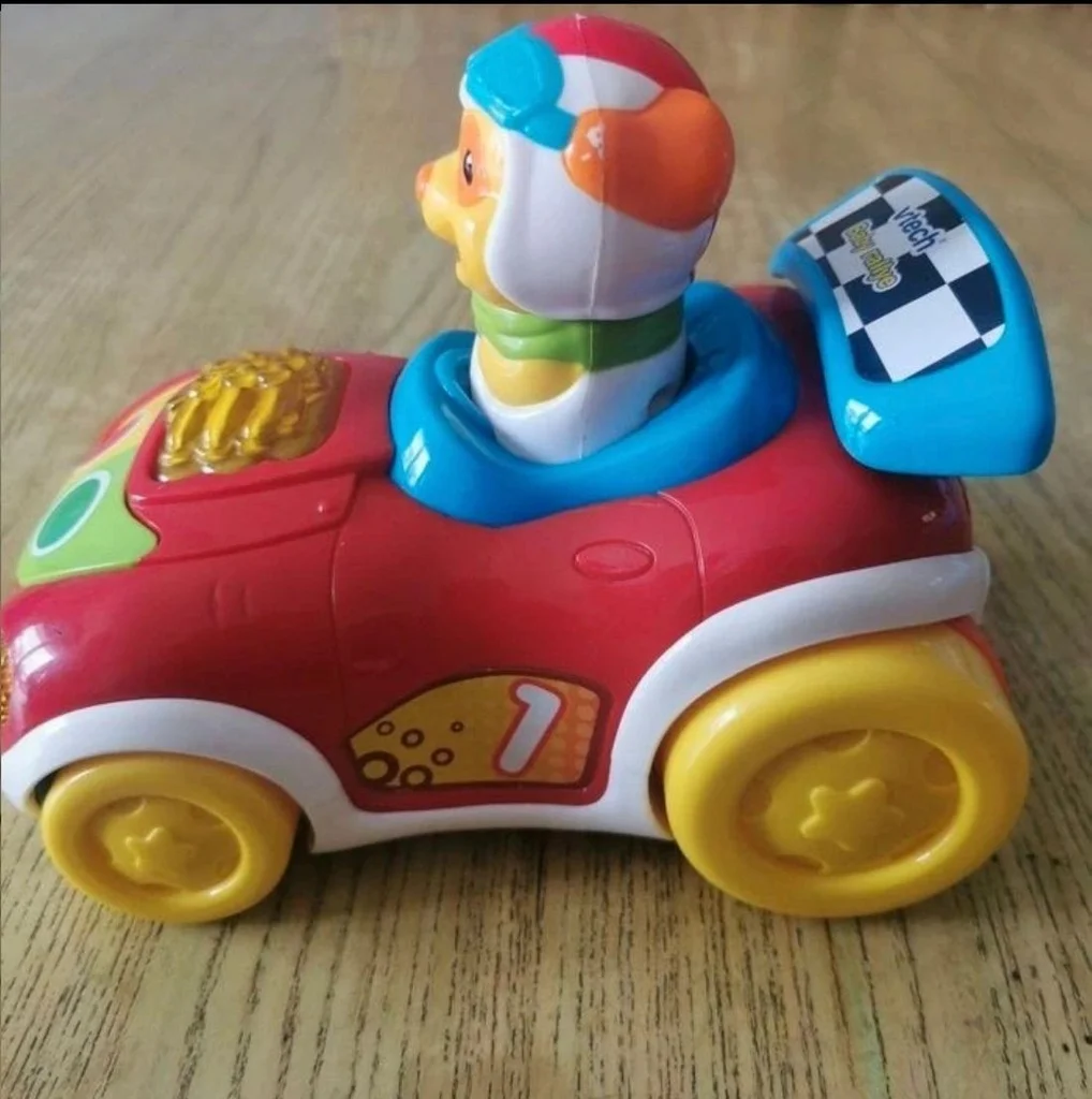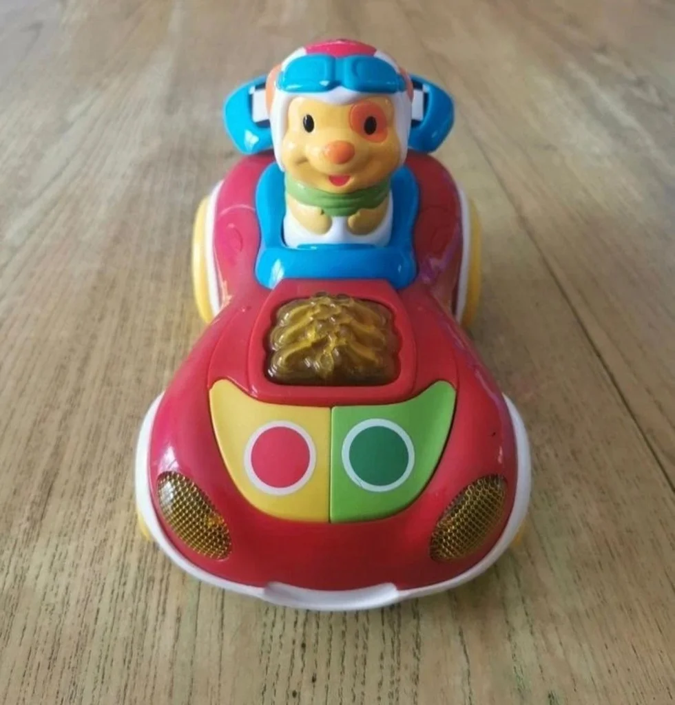 En appuyant sur le chien la voiture roule toute seule. Le bouton moteur déclenche des effets sonores et mélodie et les phares lumineux clignotent en musique. Le bouton feu vert et feu rouge pour apprendre les couleurs Un peu abîmé (voir photos)